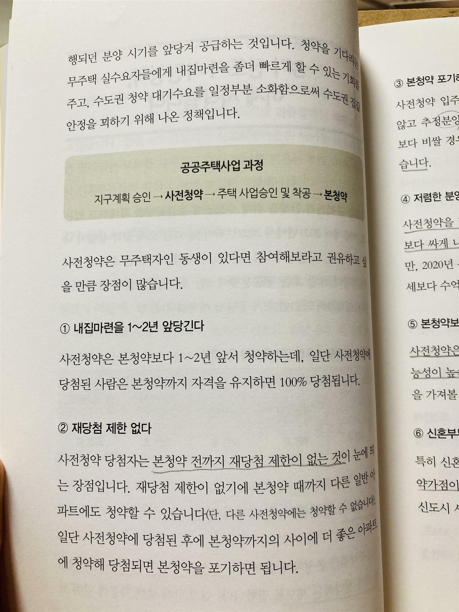 사실 수도권에 거주하지 않는 지방에서는 청약에 대한 관심도 수도권만큼 뜨겁지 않고 경쟁도 그리 치열하지 않다. 하지만 서울에 거주중인 무주택자 동생을 생각하며 열심히 책을 읽었고 결과적으로 이 책을 선물했다. 3기 신도시 청약과 관련해 정보가 일목요연하게 정리되어 있고 책을 읽고 충분히 도움을 받을 수 있는 부분이 있겠다는 생각이 들었다. 3기 신도시와 관련해 7월 1일부터 사전청약이 시작되고 있다. 사전청약은 내집마련을 본청약보다 당겨서 할 수 있다는 점, 본청약 전까지 재당첨 제한이 없다는 점, 본청약을 포기해도 패널티가 없다는 점, 분양가가 주변 시세보다 저렴학 나올 가능성이 크다는 점, 본청보다 경쟁률이 낮을 가능성이 높다는 점, 청약 가점이 낮은 30~40대가 관심을 가지기에 좋다는 점 등의 장점이 있다. 또한 이번에 공공분양의 일반 공급 비중이 확대되고 공공분양에 추첨제가 도입된다는 점에서 주목해 볼만한 가치가 있다. 경쟁률은 더욱 치열하겠지만 준비를 제대로 해서 넣어봄직하다는 생각이 들었다.