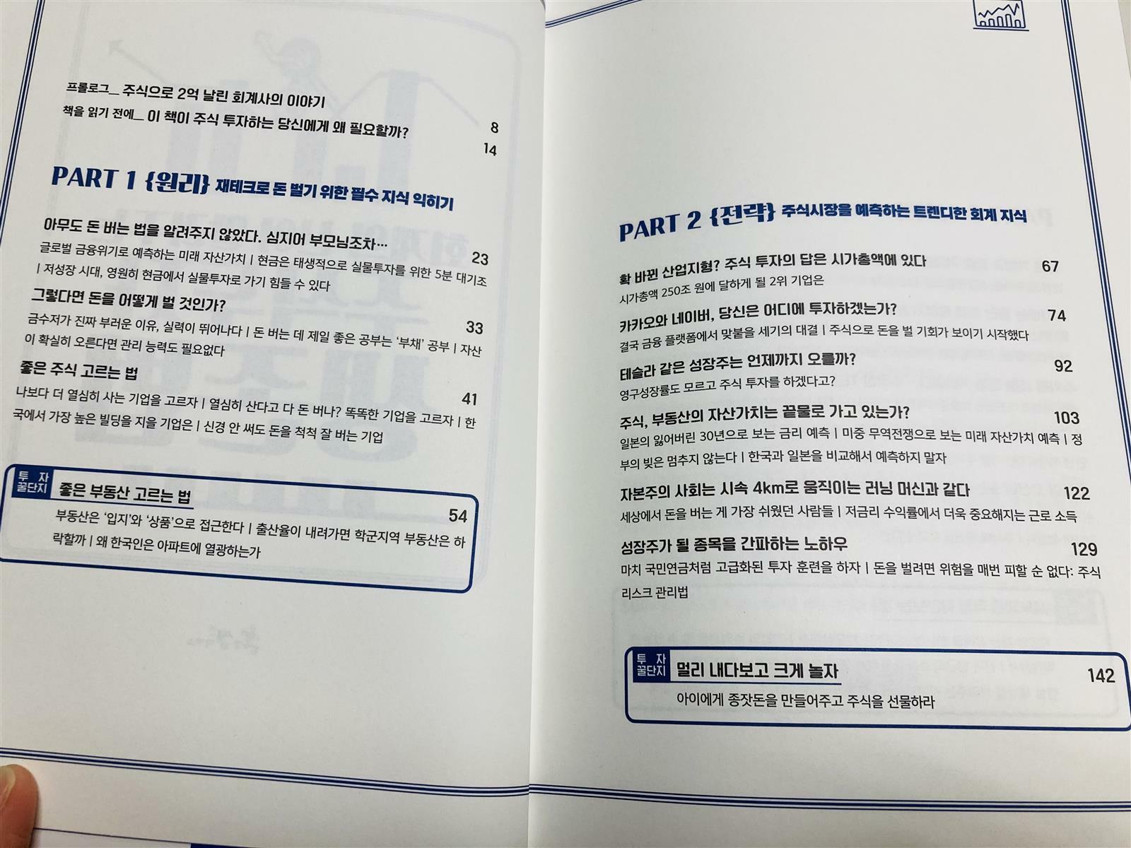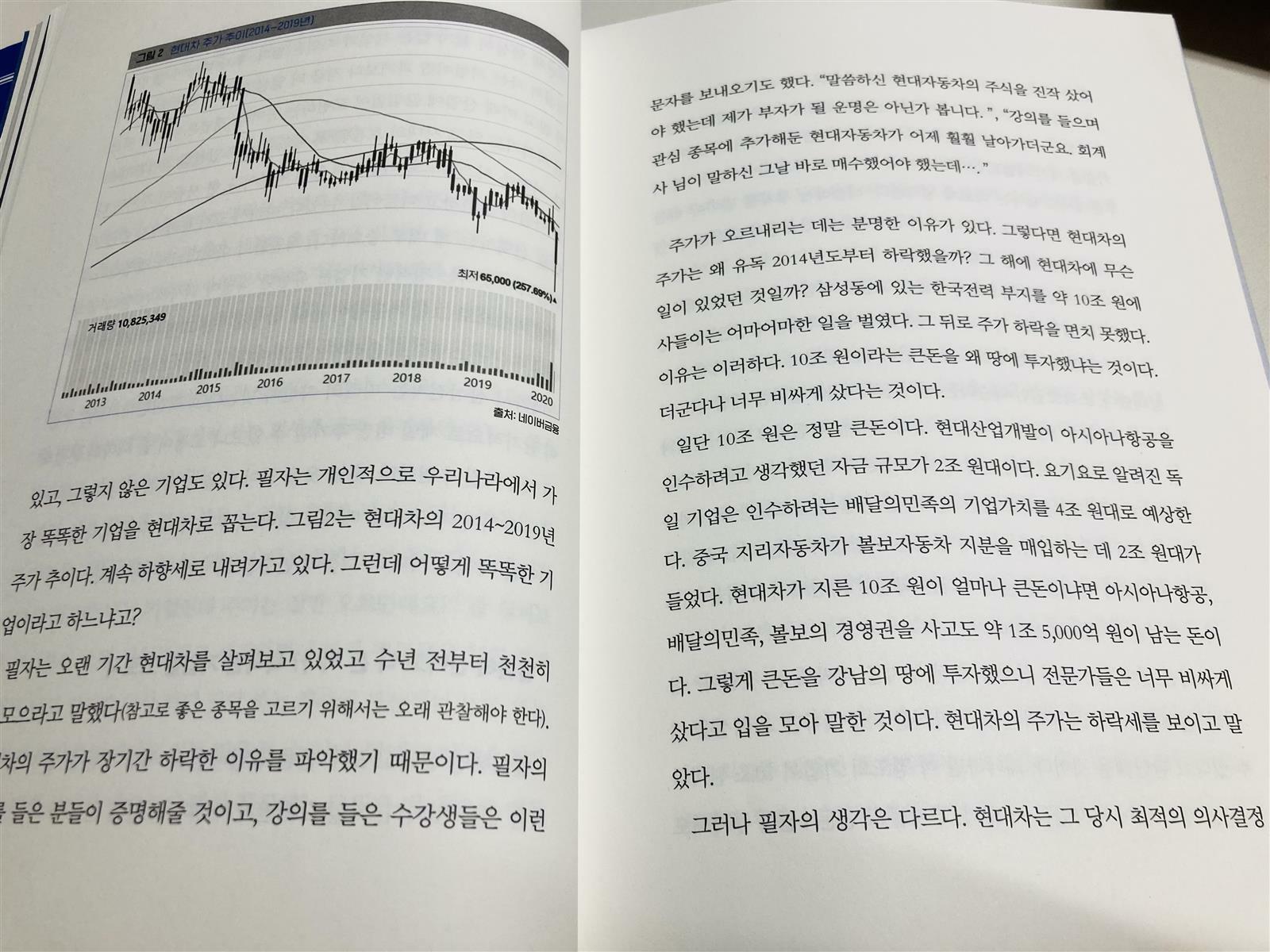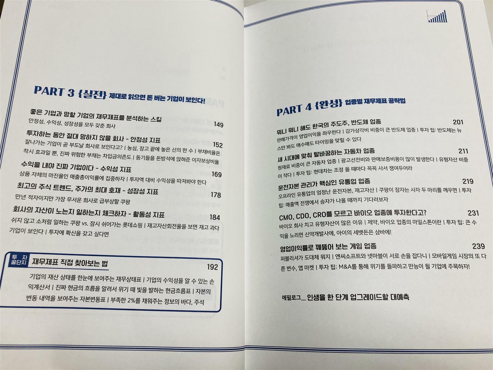 이 책을 알리는 화려한 수식어들은 절대 과장이 아니다. 주식 투자 책을 꾸준히 보고 있는데 그 많은 책들 중 이 책만큼 내 마음을 사로잡는 책은 없었던 것 같다. 회계사를 직업으로 가졌던 사람이기에 수에 밝고 돈과 매우 친하겠거니 생각했는데 과거에 아주 비싼 값의 레저를 즐긴 전적이 있는 분이었다. 프롤로그를 읽고 이 책에 더 마음이 갔던 것은 사실이다. 저자는 실제로 솔직하고 거침없는 입담의 소유자일 것이라 확신한다. 다 나열하기도 힘들 만큼 기업 특강을 많이 다닌 분의 경험을 바탕으로 탄생한 책이기에 어느 부분 하나 버릴 것 없이 너무 좋았다.
