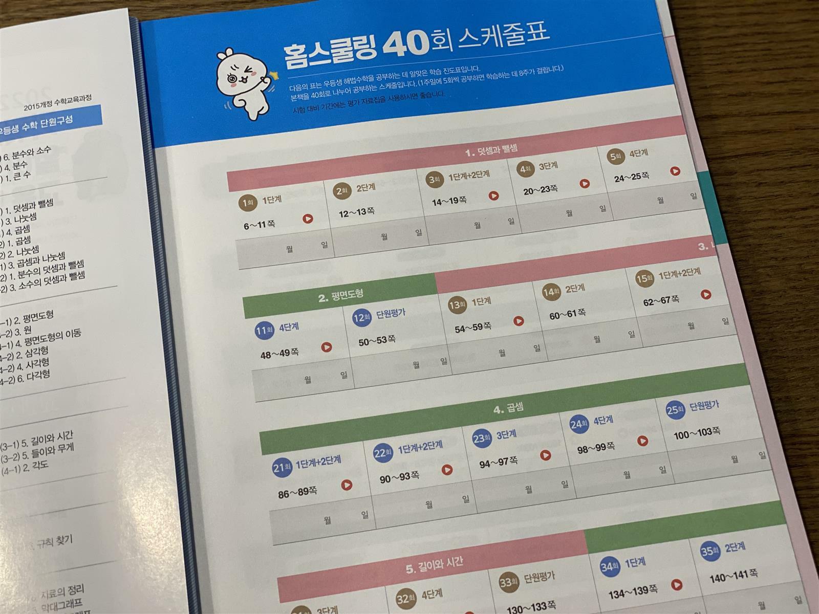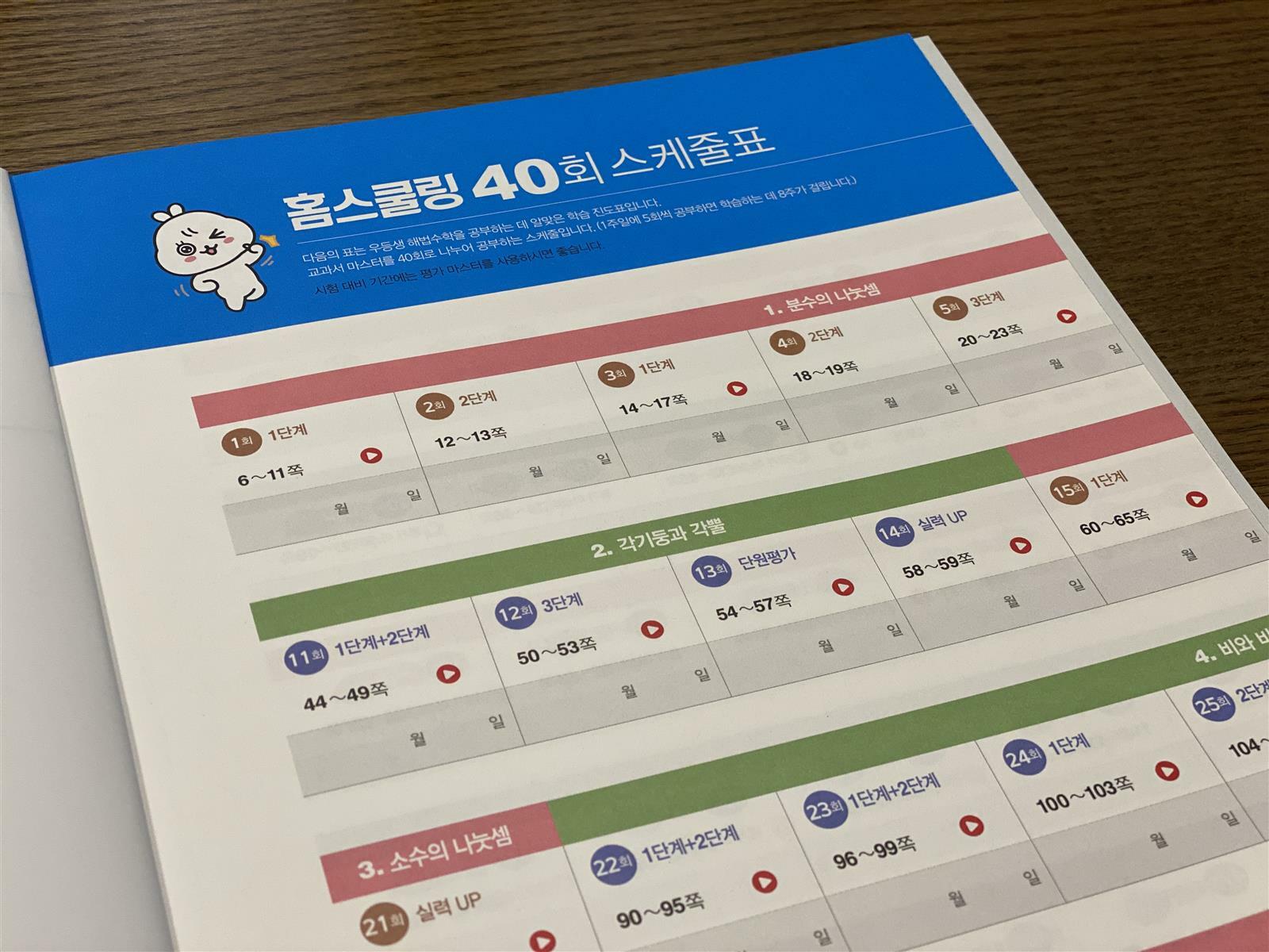 우등생 해법수학은 홈스쿨링 40회 또는 52회 스케줄로 할수 있게 되어 있어요.