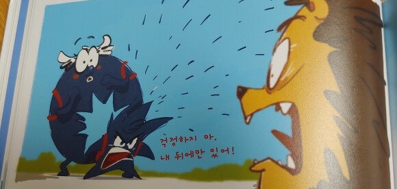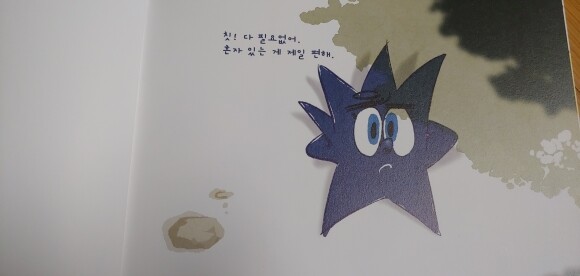 다음에 등장하는 안뾰족이는 뾰족하지 않은 친구가 아니라 마음 안이 뾰족한 친구였다. 그리고 운명처럼 만나게 되는 뾰족이와 안뾰족이. 상처주는 것이 두려워 혼자이기도 했고 상처를 주자 친구들이 피해서 혼자이기도 했던 그들은 친구가 되었다. 둘이 친구가 되는 과정을 보며 아들이 얼마나 깔깔 웃던지. 그 부분만 다시 돌아가서 보고 또 보고 하였다. 지금도 내가 그림책을 보고 있으니 이 장면이 제일 재미있었다며, 그림책을 가지고 갔다.