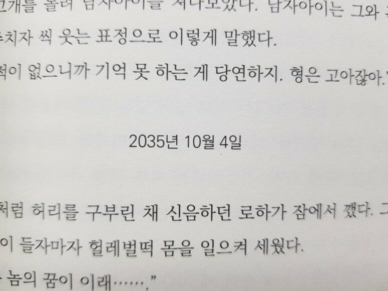 먼 미래와 멀지않은 미래를 배경으로 한 덕에 머릿속 상상은 그 힘을 갖추는 듯 했고 재난이라는 상황을 받아들이는 내용 또한 개인적인 취향에 부합되어 읽는동안 참 재미가 있었다.