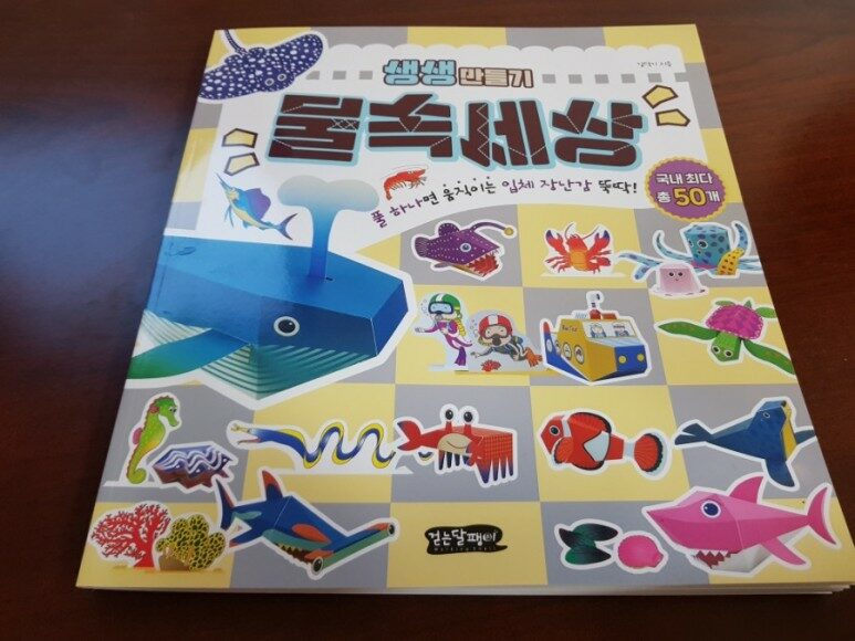 예전 다른 만들기 책들을 볼 때 도안들이 앞부분은 신경을 쓰지만 뒷편은 상대적으로 덜 예쁜 경우가 있다. 하지만 생생만들기 물속세상은 완성 후에 잘 보이지 않는 뒷면까지 세심하게 신경을 썼다는 느낌을 받게 된다. 풀칠을 어디에 해야 하는지까지 표시되어 있다보니 엄마가 잠시 한눈을 팔아도 아이 스스로 만드는데 크게 무리가 없다는 것이 두 아이를 동시 육아하는 상황에서 꾀나 장점으로 다가온다.