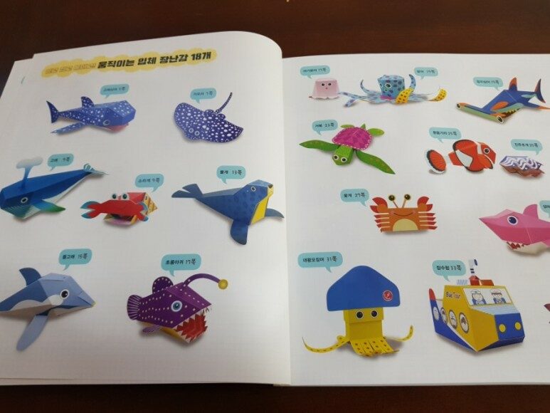 '물속세상'아이가 직접 뜯어서 접고 만들 수 있는 움직이는 입체 장난감 18종이나 들어 있다. 그러나 이마저도 어렵다고 느껴질 수 있는 어린 유아라면 굳이 풀칠도 필요 없는 초간단 장난감 32종까지. 총 50가지의 도안이 넉넉하게 있다보니 형제 자매가 책 한권으로도 함께 만들고 놀 수 있어 이만한 유흥거리가 없는 것 같다.
