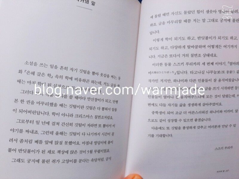 <엄마의 엄마> 는 일본으로 여행가고 싶은 독자들, 그리고 잔잔한 이야기가 읽고 싶은 독자들에게 추천하고 싶다. 현재 고2에 재학 중인 스즈키 루리카의 글 솜씨는 읽을 때 마다 놀랍다. 앞으로 어떤 이야기들을 쏟아낼 지 기대된다