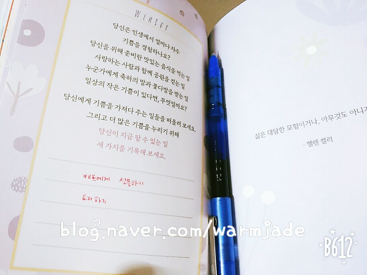 한달도 남지 않은 2020년 한 해는 다이어리라는 것을 따로 쓸 시간이 없었다. 다가오는 2021년에는 나 자신을 위한 다이어리를 써보려고 한다. 그래서 만나게 된 책 <하루 10분 나를 생각해>. 삶에 떠밀려 지쳤지만 가까스로 버티고 있다는 것. 이제는 나를 다독여줘야 할 때하는 것. (p.14) 하루 10분을 투자해서 자존감을 지킬 수 있다고 하니 왠지 마음이 갔다. "나라서 좋다. 나여서 다행이다." 같이 편안한 글을 읽고 쓰다보면 긍정 에너지가 샘솟는다. 먼저 자신을 사랑하라. 나머지는 알아서 뒤따를 것이다. 이 세상에서 무엇이든 해내려면 정말로 자신을 사랑해야 한다. (p.119) <하루 10분 나를 생각해> 에 실린 봄, 여름, 가을, 겨울 4개의 계절을 따라가면서 쓰다보면 자존감이 날마다 올라간다고 하니 마음에 든다. <하루 10분 나를 생각해> 는 그동안 나에게 무심했다고 생각하는, 스스로와 시간이 필요한 독자들에게 추천한다. 아마존 베스트셀러인데는 다 이유가 있구나. 자신의 마음을 바꿀 수 있다면, 인생도 바꿀 수 있다. (p.182)