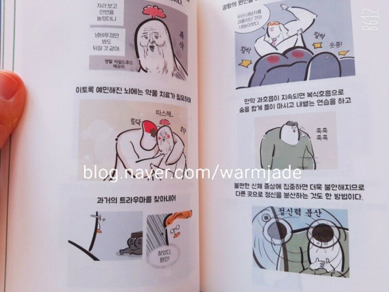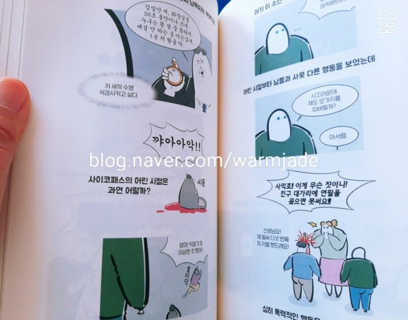 멘탈에 대한 책을 읽는 것은 언제나 즐겁다. 대학 다닐때 시간만 있으면 도서관에 가서 정신세계에 대한 책을 읽었다. 2020년에는 <할짝 심리학> 1편을 재미나게 읽었었다. 내가 좋아하는 심리학과 웹툰의 만남이라니 신선했다. 1권을 다 읽고는 2편이 나오기를 간절히 기다렸다. 8달 만에 2편이 나오다니 기뻐 <할짝 심리학 2> 를 읽었다. <할짝심리학1, 2> 권의 이 작가님은 회사에서 일을 하다가 정신건강을 위해 퇴사 후 심리학 대학원에서 공부를 했다고 한다. 심리학 공부를 마음껏 하다니 부러운 삶이다. 과호흡 증상이 생겼을 때 중요한 것은 오히려 내쉬는 작업이다. 짧게 짧게 숨을 내보내다 보면 과호흡이 진정된다. (p.76) 집밖으로 나가는 순간부터 쓰는 마스크를 하루종일 써야하는 요즘 사람들은 과호흡 증상을 겪었을수도 있다. 그럴때는 짧게 짧게 숨을 들이쉬고 내쉬는 것이 필수라고 한다. 현대인이 쉽게 앓을 수 있는 질환인 우울증, 공황장애, 그리고 조현병에 대하여 알기 쉽게 그려놓았다. 나도 몇년 전에 외출해서 광고에서 나오는 밝은 빛을 보면 어지럽고, 사람이 많이 모이는 백화점 같은 곳에 가면 숨이 가빠오면서 죽을 것 같은 경험을 자주 했었다. 혼자 공황장애인 줄 알고 언젠가 한번은 병원을 방문해 약을 타서 먹어야겠다고 생각만 했는데 알고보니 다른 병명이었었다. 그래서 공황장애가 얼마나 별거아닌 병이 아닌지 간접적으로 알고 있다. <할짝 심리학 2> 는 일단 우울할 때 읽으면 왠지 유쾌한 책이다. 심리학을 이렇게 쉽게 풀어놓은 책이 또 있을까 싶다. 1권은 다소 이론적인 학자들에 대한 내용이었다. 이번에 나온 <할짝 심리학 2> 권에서는 우울증, 조현병, 공황장애, 사이코패스 같은 우리와 살포시 가까운 질환에 대해 만화로 웃으며 읽으면 된다. 신기한 정신질환과 천재들의 정신질환에 대한 것은 보너스다. 어쩌면 많은 마음의 병은 누군가의 이해와 공감을 가장 필요로 하지 않을까? (p.117)