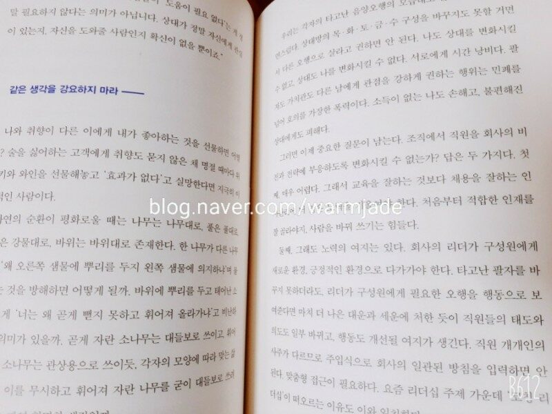 살면서 한번쯤 동양 철학 인문학의 대표책인 명심보감을 읽어보고 싶었다. 노자, 장자, 명심보감 이런 책들의 공통점이 생각보다 접근성이 쉽지 않다는 점이다. <명심보감 인문학> 은 접근성을 걱정하는 독자들을 위해 나타난 것 같다. 10월말 출간된 따끈 따끈한 <명심보감 인문학>. 이 책에는 한장 한장 좋은 글귀가 많았는데 그 중에서 내가 좋았던 글귀만 소개하고자 한다. 맛있는 우물물은 먼저 마르지만, 맛없는 우물물은 오랫동안 마르지 않은 법이지요. (p.23) 장자는 '재주가 출중하고 능력이 뛰어난 사람'으로 살려고 하면 바로 그 재주와 능력 때문에 쉽게 불행을 만날 수 있다(p.24) 는 말을 했다. 이 말은 현재 자신이 뛰어나지 않다고 좌절하는 사람들에게 해주고 싶다. 사람의 생사와 부귀는 사람이 아닌 운명에 달려있다. (p.71) <명심보감 인문학> 을 읽으며 감동했던 부분이 300년간 만석꾼 경주 최부잣집 여섯가지 가훈이다. '흉년에는 절대로 다른 사람의 땅을 사지마라. 그리고 손님이 찾아오면 후하게 대접하라. 주변 백 리 안에 굶어죽는 사람이 없게하라' 는 세가지를 기억하고 싶었다. 나도 나중에 만석꾼이되면 저걸 가훈으로 해야겠다는 생각도 했다. <명심보감 인문학> 은 사람의 화복도 예측할 수 없다는 등의 좋은 글귀가 많이 담긴 책으로 마음의 평화를 찾을 수 있는 책이다. 동양 인문학을 처음 시작하는 독자들에게 권하고 싶다