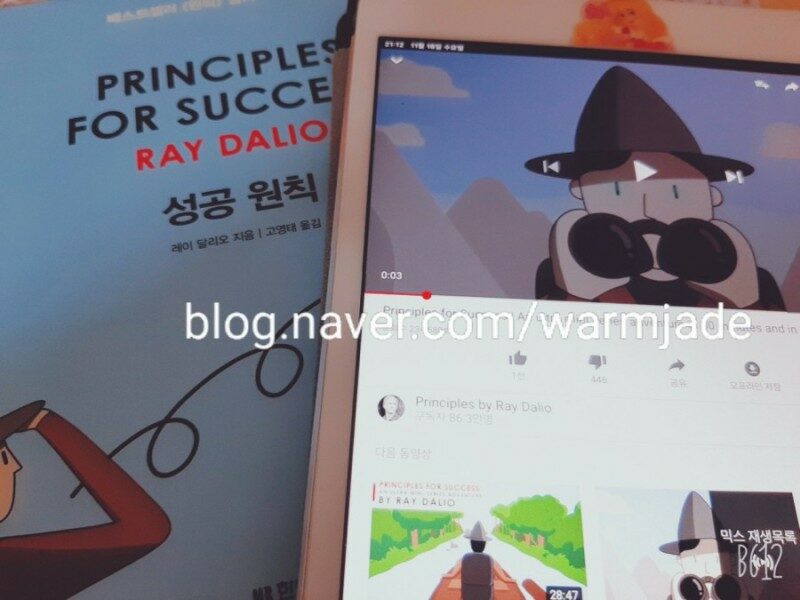 어느 순간부터인지는 모르겠는데 레이 달리오가 좋았다. 그의 책 <원칙>, <금융위기 탬플릿> 을 두 권 읽고 나니 레이 달리오의 현명함에 매료되었다. 순수한 팬심에서 읽게된 책 <성공 원칙>. 이것은 레이 달리오의 유튜브 채널에서 본 바로 그 유명한 영상의 프린트 버전으로 나온 것이다. 레이 달리오에 퐁당 빠져서 그의 유튜브 채널을 구독해서 이 영상 저 영상을 파도 타가면서 들었었다. 그 중에서도 제일 토익에 리스닝 테스트 같았던 것이 <성공 원칙> 에 대한 이것이었다. 당신은 인생이라고 불리는 모험이 가득한 긴 여행을 하고 있다. (p.6) <성공 원칙> 은 레이 달리오의 <원칙> 을 엄청나게 쉬운 언어와 그림으로 이해가 잘 되게 구성해 놓은 책이다. 150 페이지 남짓 작지만은 않은 분량인데 술술 넘어간다. 컬러풀한 그림 덕분인 것 같다. 글이 빼곡히 있는 것을 좋아하는 사람들에게 <원칙> 을 권한다면, 그보다 어리거나 그림을 좋아하는 사람에게 <성공 원칙> 을 권하고 싶다. 일생 동안 당신은 결정을 내려야만 하는 수많은 현실에 부딪히게 될 것이다. 그리고 어떤 결정을 내리느냐가 당신 삶의 질을 결정하게 될 것이다. (p.20) <성공 원칙> 을 좀 만 일찍 읽었더라면 나도 실패를 경험할 때 도움을 받아서 극복했을텐데 하는 생각을 했다. 이 책을 읽는 동안 동영상을 28분 동안 같이 재생했더니 더 이해가 잘되는 기이한 현상이 일어났다. 어른을 위한 이런 그림책이 자주 나왔으면 좋겠다. 영어 공부도 하고 인생과 성공에 대한 것도 배울 수 있는 <성공 원칙> 추천해본다. 역경을 이겨낼 것인지 아니면 소용돌이에 휘말려 추락할 것인지는 우리가 기꺼이 실패를 객관적으로 파악하고 올바른 결정을 내릴 것인가에 달려있다. (p.67)