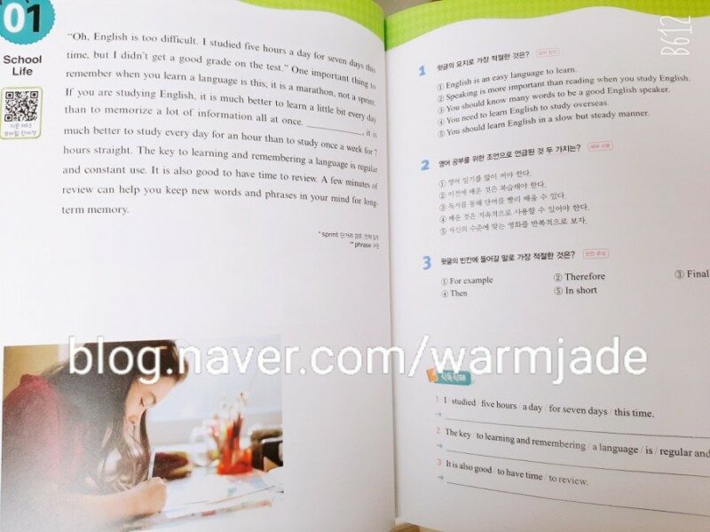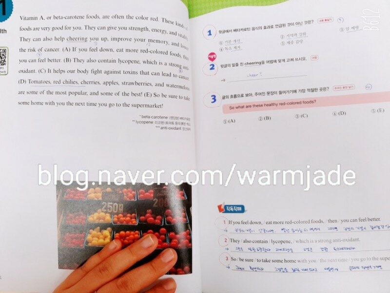 오늘은 나의 학생님과 함께 공부하는 날!!! 급 영어 권태기가 온 것 같다고 독해 공부가 하기 싫다는 학생님의 의견을 참고하여 #중등내신 #중등영어독해 #중등독해문제집 중에 심혈을 기울여 선택한 <This is reading starter 3> 보라보라한 표지에 3권은 중3 까지 레벨을 포함하여 공부할 수 있다고 합니다. 사실 표지보고 #중등내신 #중등영어독해 #중등독해문제집 을 선택한 것은 아닙니다. 얼마나 재미있게 보이느냐를 보고 선택했지요. 영태기가 오면 일단 재미있어야 공부도 하는 것이니까요. 목차를 보면 학교 생활에서부터 미국식 아침식사, 바이러스 에 이르기까지 정말 재미있는 주제가 많아요. 책에 글씨만 있으면 식상할텐데 독해주제에 딱 맞는 재밌는 그림이나 사진으로 흥미유발이 되더라구요. #중등내신 #중등영어독해 #중등독해문제집 QR코드만 찍으면 mp3 듣기, 어휘리스트, 모바일 단어장까지 제공 해준다니 만능이네 라는 생각을 했습니다. 그러니까 #중등내신 #중등영어독해 #중등독해문제집 으로 500만부 돌파를 했다고 하네요. 나의 귀여운 학생님도 즐겁게 공부하는 눈치였어요. 오늘은 그 중에서도 비타민에 대해 공부했습니다. 코로나 시대에 특히나 건강에 관심이 많아진 요즘 같은 때에 시의적절한 공부 주제가 아닐 수가 없네요. 라이코펜이라는 용어도 토마토에 많이 들었다던데 또 이렇게 만나구요. #중등내신 #중등영어독해 #중등독해문제집 <This is reading starter> 3과 함께 즐겁게 영어 공부하는 시간을 가졌습니다.