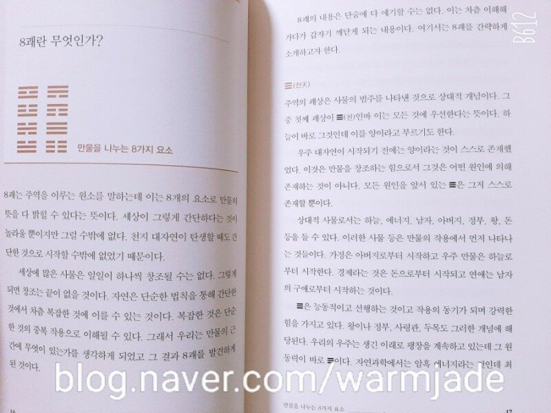 미래는 정해져 있으나 또한 정해져 있지 않다는 뜻이다. 애매모호한 것 같지만 실은 여기에 정답이 있다. 시간 현상이라 아주 민감하여 사소한 자극에도 크게 반응하기 때문에 미래를 규정하기가 어려운 것이다. 미래를 알고자 하는 마음 자체가 미래를 다르게 만든다. (p.28) 운명에 대해 공부하고 싶었다. 공자, 맹자, 주역 같은 동양철학에 대해 관심이 많아진 가을 날 방황하던 나의 눈에 들어온 책 <공자의 마지막 공부>. '때로는 쉬면서 여유를 가지라. 쉬는 것도 실은 일이다. 군대도 쉬지 않으면 전투에 임해서 효율이 떨어지는 법이다. 시합을 바로 앞에 둔 운동선수도 잠시 쉬면서 마음을 가다듬는 순간을 가져야 한다.(p.88)' 휴식의 소중함을 느끼는 요즘 눈에 쏘옥 들어오는 글이다. 위기의 상황에서 슬픔이나 좌절에 빠지거나 지나친 행동을 해서는 안 된다. 오로지 차분하고 적절하게 행동해야 할 뿐이다. (p.77) <공자의 마지막 공부> 는 펼치자마자 주역의 사주팔자 보는 법이라거나 우주의 비밀에 대한 내용이 마구 쏟아질 것만 같았는데 아니었다. 이것은 마치 인생 전반에 대한 내용이 실려 있었다. 주역이 엄청 어려울 것이라고 생각했는데 생각보다 이해할 수 있는 폭이 넓어서 만족스러웠다. 괘상이라는 것도 태극기에 건,곤, 감,리 처럼 생겨서 하나 하나의 뜻을 설명해주는데 흥미로웠다. 이 책의 저자인 초운 김승호님은 우리나라 최고의 주역학자라고 한다. 미국 프린스턴 대학에 가서 물리학자와 의사에게 주역을 강의하실 정도로 주역에 대해 전문가라고 하신다. '일하고 나면 쉰다는 것이 요점이다. 여기서 쉰다는 것으 평범한 내용인 것 같지만 실은 내면에 깊은 뜻이 있다. 쉰다는 것은 단순히 육체 에너지를 충천하기 위함이다. 마음도 쉰다는 뜻이다. 이는 특히 중요한데 마음을 쉬면 여유가 생겨서 집착에서 벗어날 수 있다.' (p.135) 주역에서 쉼의 중요성에 대하여 자주 언급하는 사실이 놀라웠다. 그 옛날에도 쉼이 중요한 진리였구나. 무대에 서기가 두렵거나 앞길에 난관이 예측된다 해도 겁부터 먹을 일이 아니고, 어떤 문제를 결정해야 할 때도 너무 떨면 안 된다. 우유부단은 더 큰 해를 불러오는 법이다. (p.83) <공자의 마지막 공부> 는 주역에 흥미가 있는 독자들에게 추천하고 싶다. 주역을 공부하는 입문서로 적절하다 생각이 드는 책이었다. 책에 나온 괘상 중에 풍지관 즉, 땅 위로 바람이 분다는 것이 제일 마음에 들었다. 나도 주역에서 바람처럼 세상을 관찰하며 살고 싶다는 생각을 하게 되었다. 본 리뷰는 출판사에서 도서만 무상제공 받아 주관적으로 적었음을 알려드립니다.