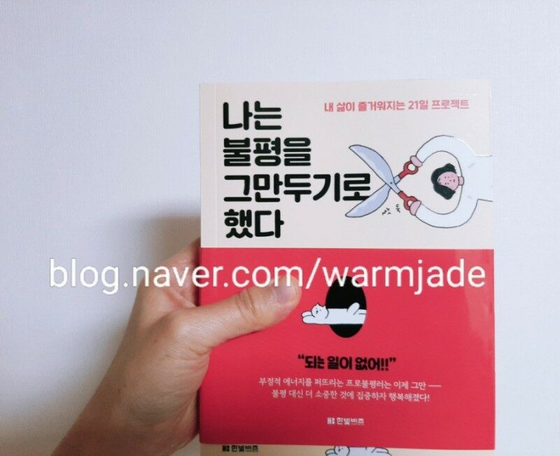내 인생이 다 마음에 들지 않아도 딱 하나 마음에 드는 것을 찾자면 그건 인생을 살아내는 자세이다. 가진 것은 별로 없어도, 끝내주는 인맥을 가지고 있지 않아도, 건강을 잃는 순간에도 나는 긍정적이었다. 그런 긍정의 아이콘인 내가 요새 살짝 살짝 불평을 하며 매일 마주치는 사람들을 대하는 것을 알게 되었다. 특히 아빠에게. 그래서 읽은 책이 <나는 불평을 그만두기로 했다> 이다. 나의 이 변화가 호르몬 때문인지 뭣 때문인지는 모르겠으나 다시 예전의 나로 돌아가보려고 결심했기에 책을 읽기 시작했다.