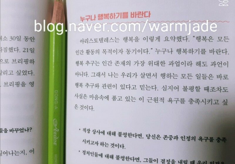 대청소하기, 내가 주로 하는 불평 알아보기 처럼 이 책의 21일 챌린지는 어렵지 않았다. 오히려 너무 쉬운 것 아닌가? 이래서는 21일 후에 불평을 그만 둬 지겠어? 하는 생각이 더 들었다. 1부를 거쳐 2부, 3부를 읽는 동안 각 부가 끝날 때마다 챌린지가 덧붙여 있는 색다른 구성으로 편집 되어있는 책이었다. 그런데 읽으면 읽을 수록 하루에 하나씩만 바꾸면 되니까, 도전하면 되니까 그렇게 어렵다는 생각을 안하게 되었다.
