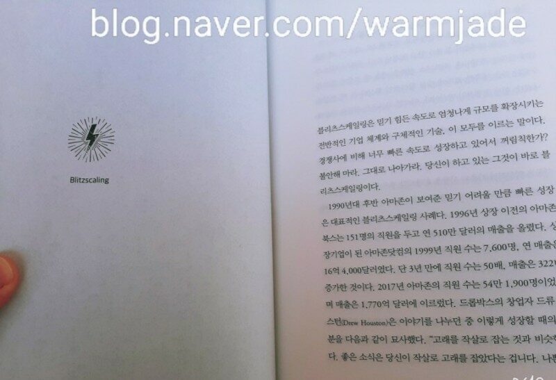 지인이 스타트업을 하는 중이라 책을 권해줄 걸 찾다가 <블리츠스케일링> 을 만나게 되었다. 전에 다니던 회사의 대표에게 투자를 받아서 IT쪽으로 밤낮없이 고군분투 하는 모습을 보고 책이라도 권해줘야지 싶었다. <블리츠스케일링> 을 주면서 '너도 잘될꺼야 ~힘내라' 이렇게 말해주고 싶었다. 친구따라 강남 간다고 나도 스타트업의 경영방식인 블리츠 스케일링에 대해 공부하는 기회가 되었다. 성공 사례들은 모두 기술기업의 것이다. (p.88) 스타트업이 스케일업으로 가는 가장 빠른 직선 코스는 단연 블리츠스케일링 을 통해 초고속으로 성장하는 것이다.(p.26) 그렇다면 이 '블리츠스케일링'이란 무엇일까? 급작스럽고 전면적인 활동을 뜻하는 말로 blitz라는 말에서 비롯되었다고 한다. 이것은 믿기 힘든 속도로 엄청나게 규모를 확장시키는 전반적인 기업 체계와 구체적인 기술을 이르는 말(p.47)이라고 한다. 블리츠스케일링 을 할 때는 신중하게 결정하되, 일단 결정한 뒤에는 거기에 모든 것을 걸어야 한다. (p.49) <블리츠스케일링> 을 읽으며 알게 된 사실인데 구글 아마존 뿐 아니라 넷플릭스까지 죄다 블리츠스케일링 을 이용해 성공한 사례였던 것이다. 소위 말해 요즘 떳다 싶은 기업들은 블리츠스케일링 과 연관이 없는 것이 찾기 힘들 정도였다. 잘 나가는 트렌드에 맞는 전략법이기에 스타트업에서는 블리츠스케일링 을 잘 활용하는 것이 관건이 될 수도 있겠다 싶은 생각을 했다. 작은 스타트업만 블리츠스케일링 을 하는 것이 아니라 대기업 마저도 이걸해야한다니. 하드커버로 된 전공서적스러운 이미지의 블리츠스케일링. 이 책은 이 전략에 관심있는 박새로이 같은 스타트업을 준비하는 사람에게 추천하고 싶다. 그 어느 책보다 블리츠스케일링 에 대해 빠삭하게 알 수 있어서 좋은 책이라 말할 수 있다. 미래가 과거보다 나을 것이라고 믿는 사람에게 블리츠스케일링 은 희망이다. (p.443)