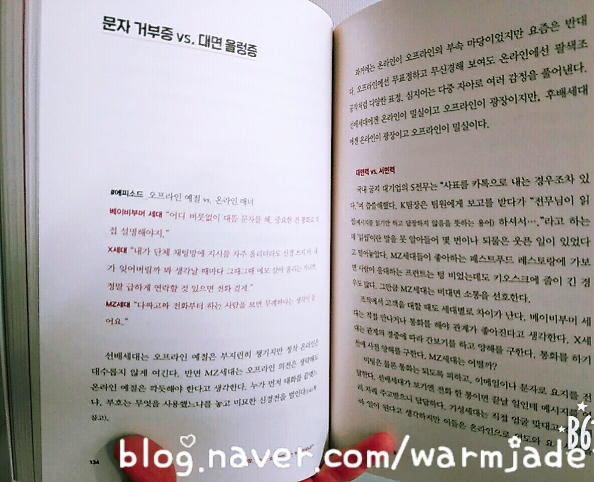 <센 세대, 낀 세대, 신세대> 책은 옛날에 읽었던 세대 차이에 대한 책과는 아주 많이 달랐다. 우선 각 세대의 특징을 자세히 이해 잘되게 묘사해놓았다. 그래서 마치 상황이 내 눈앞에서 보이는 것만 같다. 묘사에서 그치는 것이 아니라 각자 다른 3세대가 조화롭게 지낼 수 있는 방법을 적어놓았다. 이 책을 읽고 있는 나는 밀레니얼 세대에 속하는데 Z세대의 '모든 이의 친구가 되려면 결코 진정한 친구가 될 수 없고, 모두에게 잘하느라 탈진하느니 자신과 사이좋게 지내는 게 인생의 진리'(p.200) 라는 말에 특히 공감하며 읽었다.