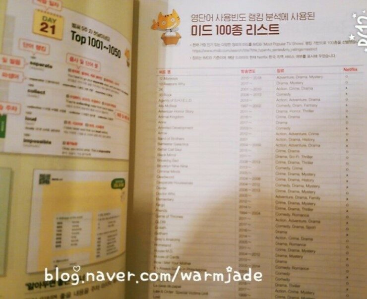 이 책에 나온 어휘는 우리의 사랑하는 미드들 Arrow, Ally McBeal, Criminal Minds, Dexter, Doctor Who, Desperate Housewives, Friends, Game of Thrones, Gotham, Grey's Anatomy, Homeland, House M.D., How I met your mother, Lost, Law & Order, Lucifer, Modern Family, NCIS, New Girl, Once upon a time, Orange is the New Black, Prison Break, Sex and the City, Sherlock, Suits, Supernatural, The Big Bang Theory, The Blacklist, The Handmaid's Tale, The Walking Dead 등에 자주 나온 단어라는 사실이 충격적이다. 저기 나온 미드 목록은 책에 실린것 반도 안되는, 다만 내가 본 미드이다. 오랫만에 제목을 보니 내용도 생각나고 반가웠다.