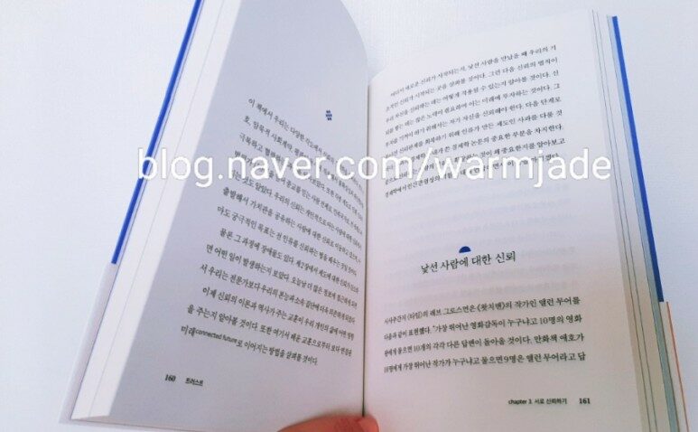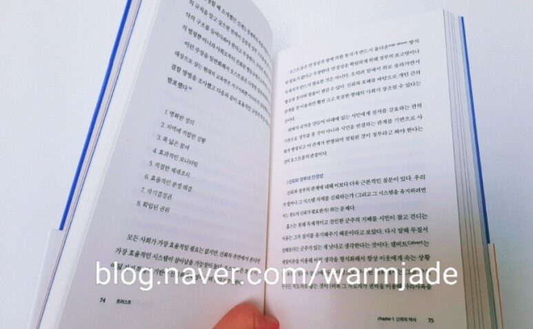 신뢰가 경제에 주는 영향은 무엇일까? 우리 사회가 제대로 돌아가는 것은 아무래도 서로에 대한 신뢰가 기본이 되었기 때문일 것이다. 트러스트 즉, 신뢰가 중요하다. 경제와 신뢰의 관계에 대해 배우기 위해 읽게 된 책 <트러스트>. 시원한 표지와는 달리 이 책은 다소 깊은 내용이 많이 담겨 있었다. 경제학을 전공하지 않은 탓에 배경지식이 모자란 나, 그래서인지 다른 책보다 읽는데 시간이 더 걸렸던 것 같다.