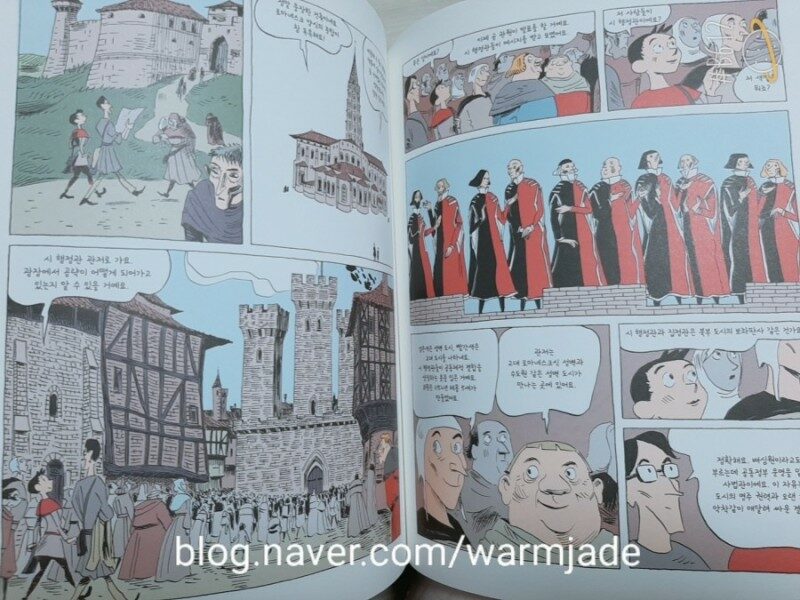 만화같기도 하고 동화같기도 한 <만화로 배우는 서양사 중세 1> 을 읽었으니 <만화로 배우는 서양사 중세 2> 또한 읽었다. 내 독서는 재미를 추구하기에 재미있는 것만 읽으려 노력한다. 1편에서는 기사들과 수도원 이야기를 집중적으로 읽었다. 2편에서는 어떤 내용이 나올까? 세상은 넓고 그림 잘 그리는 사람은 많다. 1편과 2편의 작가가 같은 사람일 줄 알았는데 다르다! 네모난 액정에 코나 박고 있을 시간에 진짜 세상을 조금이라도 더 둘러보는 게 어떨까요? (p.26) <만화로 배우는 서양사 중세 1> 에서는 역사이야기로 바로 시작했다면, <만화로 배우는 서양사 중세 2> 에서는 현재 두 캐릭터가 이야기를 이끌어간다. <왕좌의 게임> 덕후였지만 시대적인 배경이 중세라는 것을 <만화로 배우는 서양사 중세 2> 를 읽으며 처음 알았다. 만화를 재밌게 읽다보면 책의 후반 부에는 글로써 내용을 정리해주는 점이 마음에 들었다. 글씨도 큼직해서 아이들도 거부감 없이 잘 읽을 수 있을 것 같다. 우리가 맛본 사랑의 모든 희열은 나에게 너무나도 달콤하여 그 추억을 사랑할 수밖에 없고 내 기억 속에서 지울 수 없소. (p.97) 과거를 경험한다는 건 우리에게 남아있는 흔적을 따라가보는 일이니까요. (p.114) <만화로 배우는 서양사 중세 2> 는 1권과 다른 매력을 느낄 수 있었다. 이 책은 <왕좌의 게임>이나, <몬티 파이튼의 성배>, <백설공주>, <로빈후드>, <아서왕의 검>, <해리포터 시리즈> 를 보고 중세에 관심을 갖게된 독자님들에게 배경지식을 형성하는데 좋은 책이라 추천하고 싶다. <만화로 배우는 서양사 중세 3> 권이 기다려진다.