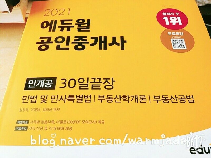 공부가 잘 되지 않는다. 마음에 압박감이 느껴진다. 공인중개사 시험은 코앞에 다가온다. 이럴 때 필요한 것이 바로 바로 <에듀윌 공인중개사 민개공 30일끝장> 이 책 한 권에 #공인중개사민법, #공인중개사부동산학개론, #공인중개사공법 공인중개사 합격에 아주 중요하다는 세 과목이 포함되어 있다. #공인중개사책추천 <에듀윌 공인중개사 민개공 30일끝장> 을 받기 전에는 선생님들이 찍어주시는 것을 내가 셀프 스터디 하는 책인 줄 알았다. 책을 받고 보니 책에 QR을 스캔하면 무.료. 강의가 뜨는 시스템이었다. 일타 교수님들의 명강의가 책 한권만 사면 공.짜.라니. #공인중개사책추천 에듀윌 기초서, 기본서에 싫증난 수험생들에게 요것만 콕 찍어서 "암기하면 됩니다" 해주는 책이니 수험생 입장에선 좋을 것 같다. 정규강의 들을 돈이 없는 수험생이시라면 기초강의 듣고 바로 이 책 사서 무료강의를 들으시면 괜찮을 것 같다는 생각도 들었다.#공인중개사책추천 올컬러에 구성이 깔끔하다. 외워야할 것만 추려놓았다. 역시 에듀윌. 기출 그리고 예상문제까지 담았다. 시간없는 수험생을 배려한 구성이구나 싶었다. <에듀윌 공인중개사 민개공 30일끝장> 은 시험 전 마지막으로 중요 포인트만 콕 찝어주는 것이 필요하다 싶은 수험생들에게 추천하고 싶다. 또한 기초서와 기본서 만으로는 뭔가 불안하다 싶은 수험생들에게도 추천한다. 32회 공인중개사 시험을 준비하는 좋은 책이 될 것이라 생각한다. #공인중개사책추천 #공인중개사민법 #공인중개사부동산학개론 #공인중개사공법 세 가지 과목을 한 권에 끝낼 수 있어서 더 좋은 책. 30일의 여유만 두고 구매하길 추천한다. 본 후기는 에듀윌 온라인 스터디 참여하여 솔직하게 작성한 후기입니다. #공인중개사책추천 #공인중개사민법 #공인중개사부동산학개론 #공인중개사공법