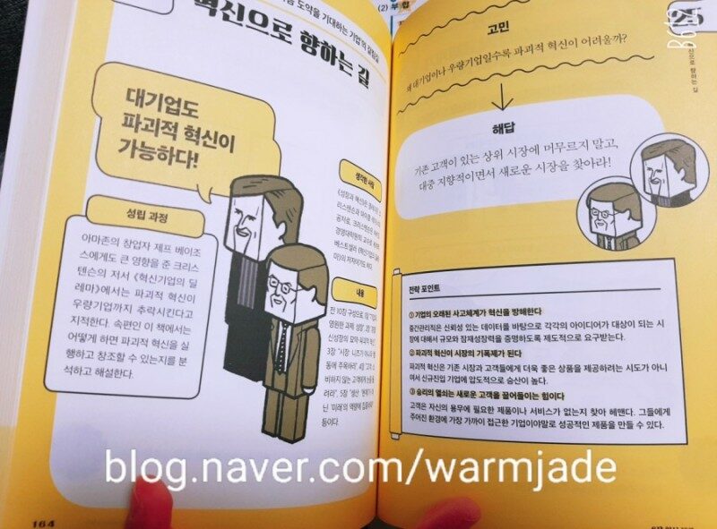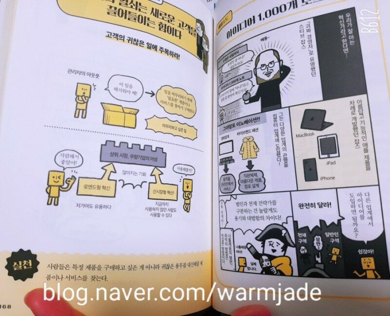 만화를 읽다보면 <1페이지 전략 수업> 책의 마지막 장을 읽고 있는 자신을 발견하게 될 것이다. 많은 내용 중 아마존의 전략이 참 재미있었다. 서적 슈퍼마켓에서 시작해 모든 것을 다 파는 아마존. 한국도 다양한 인터넷 서점이 있지만 아마존같은 서점이 나타나지 않는다는 점이 아쉬웠는데 전략의 차이였다. 여러 분야 중 경영 관련 독자들이 수혜를 보게 될 책이라 생각한다.