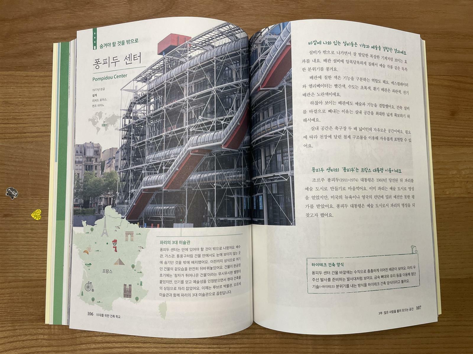 전 세계의 랜드마크 건축물이 세계지도로 한눈에 위치와 이름이 소개되어있고, 건축과 관련된 건축용어들, 건축일과 과정을 쉽고 일러스트로 재미나게 소개되어있어 참 좋았다. 한 장 한 장 넘길수록 제목엔 10대를 위한 으로 시작하지만 10대부터 보아도 좋을 20대 30대에게도 입문용으로 정말 좋은 책이다.