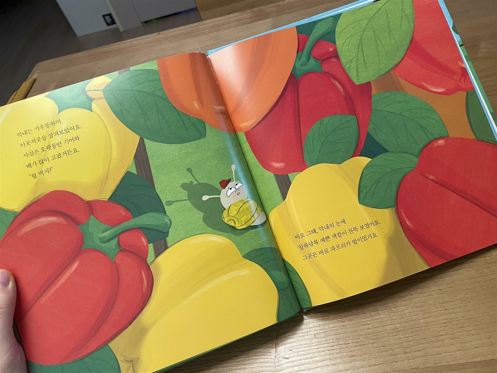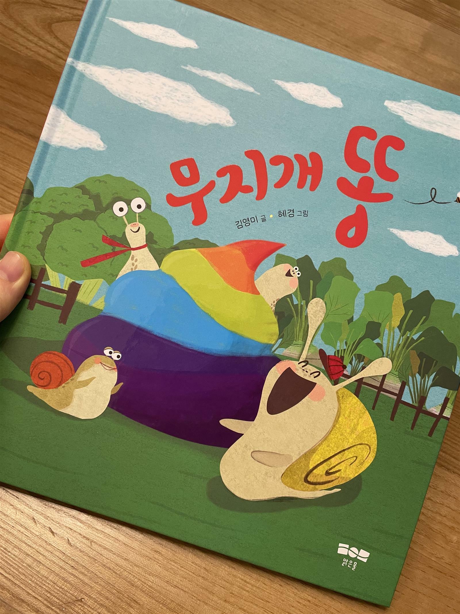 삼형제를 둔 달팽이 엄마의 고민과 & 식습관을 올바르게 고치는 엄마의 지혜를 귀여운 달팽이가족의 이야기로 담은 생활동화책입니다. 첫째와 둘째는 편식을 (좋아하는 것만 먹기를 고집) 막내는 아에 먹는것에 관심이 없는 흥미가 없는 아이에요. 무만 좋아하는 아이는 하얀응가를 브로콜리만 좋아하는 아이는 초록응가를 누고 막내는 비쩍 말라있어요. 고민스러운 엄마달팽이는 아이들을 데리고 알록달록 농장으로 피크닉을 갑니다. 채소나 과일을 보면 참 모양과 색이 예쁘단 생각을 자주한답니다. 씻고 자르고 데치고 볶은 후 요리로 나오다보니 우리아이들은 식재료 원래의 모습을 잘 모를 것 같아요. 마트나 시장에가서 장을 보고나 요리과정에 참여를 하면 좋겠지만, 요즘엔 다들 식재료도 집앞으로 배송받고 음식도 다 손질된 밀키트도 다양하고 아에 요리를 배달받기도 하는 세상이니까요. 알록달록 파프리카를 바라보는 막내의 모습이 담긴 책장을 넘기다말고 아..! 세상에 이렇게 어여쁘고 다양한 본래의 모양과 색깔 냄새들이 있는데 우리아이는 책으로만 보고 이걸 실제로 만져보고 탐구해볼 기회가 적었구나 싶더라구요. 그리고 특히 빨강 노랑 초록 알록달록한 파프리카를 바라보는 막내달팽이의 표정을 보면서 생각해보면 파프리카 참 예쁘지. 단단한데 비어있어서 두드려도 재미나고 씹을 때 아삭이는 소리, 아름다운 색깔 등..! 조리 전 깨끗이 세척항 식재료 하나만 베어먹어 보았을 때의 맛, 식감, 향을 우리 아이에게 보여줘야겠구나! 라는 생각을 해보았습니다. 농장으로 떠난 소풍에서 달팽이삼형제는 골고루 다양하게 잘 먹는 즐거움을 경험하고 깨닫게됩니다. 그리고 건강한 무지개똥도 누게되지요. 아이를 키우다보면 응아를 통해 아이의 영양이나 상태를 알 수 있어요. 묽을 때 찬거 너무 많이 먹으면 안되겠구나.. 며칠째 대변소식이 없을 때 물을 많이 마시고 섬유질 많은 것들 위주로 줘야겠구나 하고 말이에요. 올바른 식습관 형성을 응아와 연결하여 너무나도 재미있고 자연스럽게 녹여낸 생활동화책 맑은물 무지개똥 추천합니다.