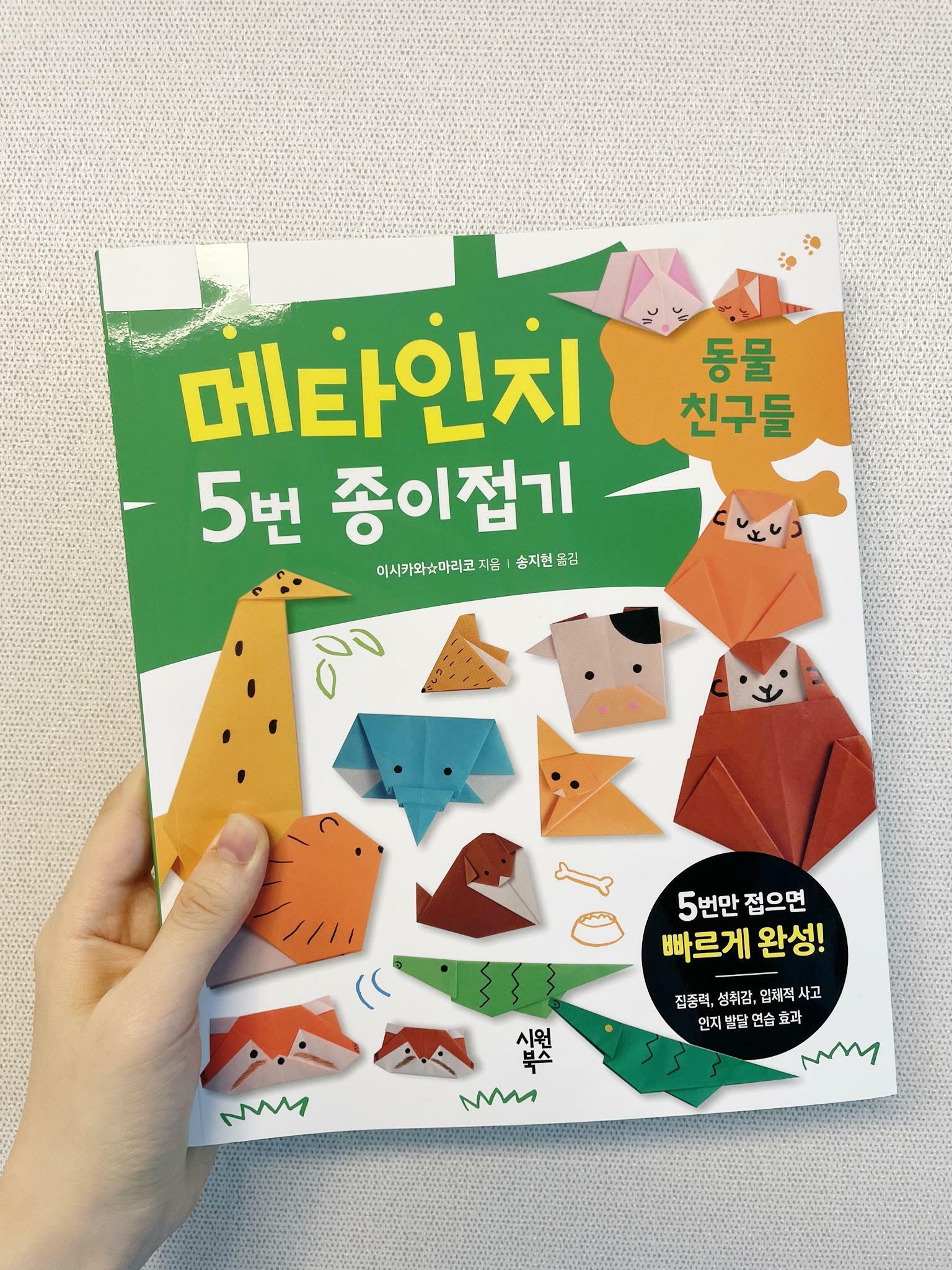 안녕하세요 5세 아이를 키우고있는 육아맘입니다. 아이가 악력이 좋아서인지 색연필을 곧잘 쥐고 그림을 그리는것에 흥미를 가지더니, 어느새 가위질도 참 잘하더라구요. 그리고 자연스럽게 소근육 발달의 꽃인 색종이접기에 도전합니다. 집에서 비행기접기는 몇번 함께 시도한적 있는데, 선에 맞추어 접는게 아직은 많이 어려워하였습니다. 그리고 아이와 마주보며 주로 활동하다보니 제가 접는 방향이 아이가 보는 시선에선 반대라서 따라접는 과정에서 고전했던 것 같습니다. 그래서 좋은 교재가 있으면 바로 옆에 두고 스텝바이스텝으로 따라접으면 좋겠다 생각했고, 그래서 비교적 간단하고 아이가 친숙하게 느끼는 색종이접기가 없을까? 고민하던 즈음에 출판사 시원북스의 메타인지 5번 종이접기책을 만났습니다. -아이가 좋아하는 동물을 접어보기 : 친숙한 대상 (동물 외에도 꽃밭이 현재 출판되어있으며 몬스터, 요리 등 다른 버전도 예정이라고 합니다) -5번 접어서 완성하기 : 간단한 과정 -종이접기 기호와 접는법 등의 설명 : 초보도 쉽게 따라하는 가이드라인 곰 고양이 코알라 고슴도치 강아지 판다 사파리 코끼리 사자 기린 레서판다 해달 소 돼지 원숭이 사막여우 악어 다양한 동물 종이접기가 가능합니다. 큰 스케치북에 위처럼 동물을 접은 후 거대한 숲/초원처럼 배경을 그림그려서 아이가 접은 동물을 붙여줄 생각입니다. 개인적으로 종이접기가 아이에게 좋다고 생각되는 이유는 꼭지점, 선, 면을 직접 보며 생각하게되고 한번 접으면 삼각형이 나오고 사각형이 나오면서 도형을 자연스럽게 느낄 수 있습니다. 또한 대칭의 개념을 손으로 만들어보며 시각적으로 체험하며 방향성 도형 공감각을 키우는 좋은 시간이라고 생각합니다. 물론 손끝에 힘도 줘보고 소근육을 발달시키고 집중해보면서 오롯이 내 두 손으로 반듯한 네모 색종이를 접어 새로운 무언가를 탄생시킨다는 창의성발달과 성취감에도 만족을 느끼겠죠? 완성작과 순서도가 크게 나와있어서 좋았습니다. 의외로 색종이접기책을 검색하면 종이접기 순서가 작게 표시된경우도있고, 때론 너무 두꺼운 책이라 안펼쳐져서 종이접을 때 책이 계속 덮히는 경우도 있더라구요. 메타인지 5번 종이접기책은 입체적으로 스탠딩이 가능한 동물까지도 단 5번 만에 뚝딱 접어지고, 눈만 콕 콕 찍어주면 귀엽고 친숙한 동물이 완성됩니다. 가이드라인부터 동물구성 책의 활용도가 좋아서 두고두고 주말마다 아이와 가정에서 집콕놀이 엄마표놀이할 때 유용하게 사용될 것 같습니다 :-) -서평단에 선정되었습니다