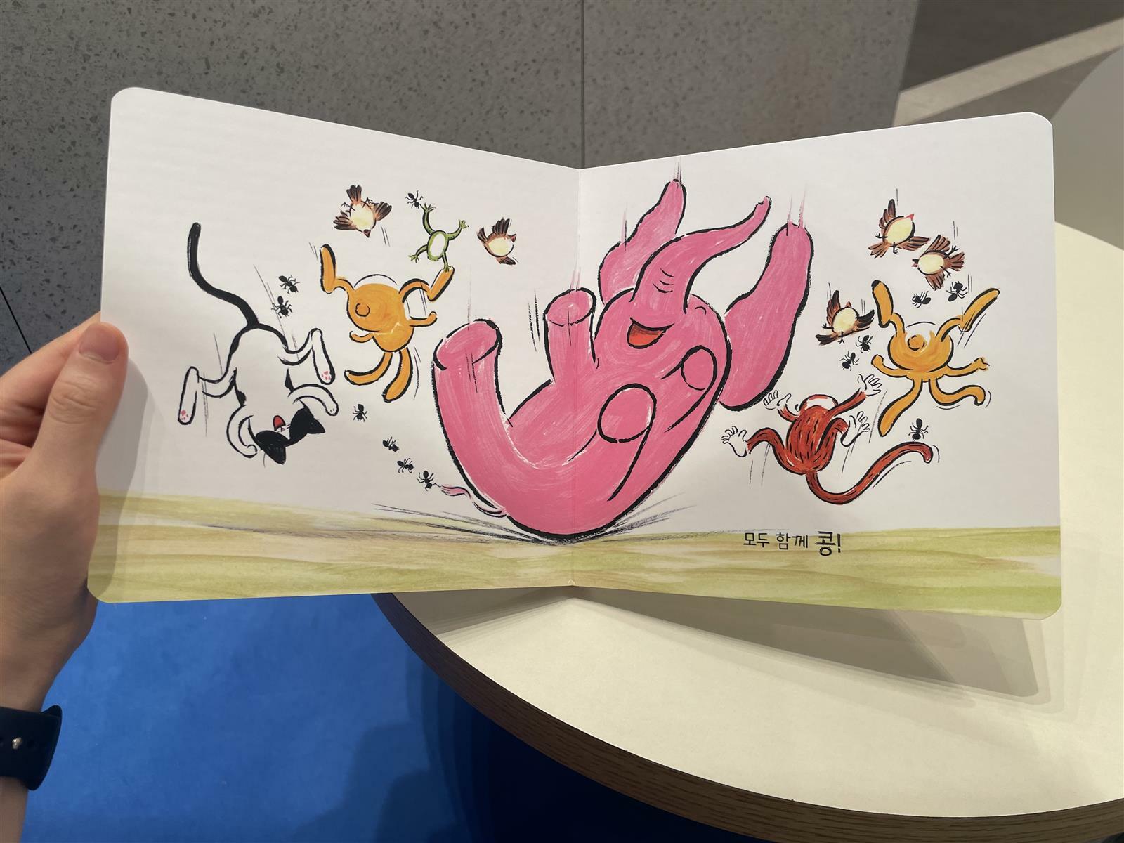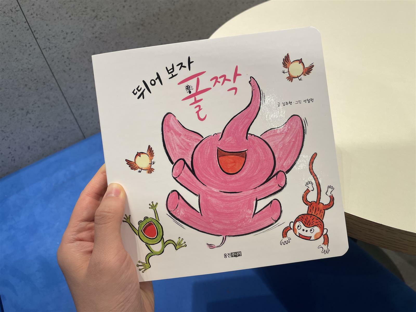 “뛰어 보자 폴짝” 이라는 유아보드책을 읽으며 정말 감탄했다. 단순한 그림책인 것 같은데 읽을 수록 잘 만들어진 책이라는 생각이 깊이 든다. 1. 동물 특징이 묘사가 자연스럽게 잘~ 되어있다. 의심많은 고양이는 화들짝 놀라고, 뒷다리가 긴 고양이와 팔이 긴 원숭이 (끈을 이어 묶다가 기다란 원숭이 꼬리를 묶는 그림이 나오는데 아이도 나도 얼마나 웃었는지 모른다. 센스가 돋보이는 삽화!) 귀와 발이 크고 긴 토끼와 작은 몸짓으로 함께 움직이는 하늘의 참새와 땅위의 개미들.. 2. 작가님의 의도?가 들어가있는지는 모르겠지만 수세기 스감각 기르기가 녹아있어 참 유익하다. 크고 작은 길고 짧은 동물들 혼자 뛰는 동물과 함께 뛰는 동물 몇 마리 인지 세어보기도하고 크기나 길이를 비교해보기도 한다. 3. 협동 관찰 혼자 때론 다같이 스토리와 일러스크가 무척 탄탄한 웰메이드 그림동화책이다. 포유류 조류 양서류 등 각 종마다 놀다가 덩치가 아주 큰 코끼리를 위하여 다같이 힘을 합쳐서 모두가 참여하는 모습까지 재미와 교훈을 다 잡은 책이다. 고양이 토끼 개구리 원숭이 참새 개미 코끼리..! 다양한 동물들이 나와서 흥미롭고, 색색의 다채로운 컬러들이 있어 아이의 시선도 오래 머무는, 스토리도 삽화도 사랑스러운 뛰어 보자 폴짝~! 보드북이라 막내아기가 보아도 안전하고 첫째아이도 베임이나 찢김이 적은 튼튼한 책이라 좋은 웅진주니어 그림동화책 추천합니다^^