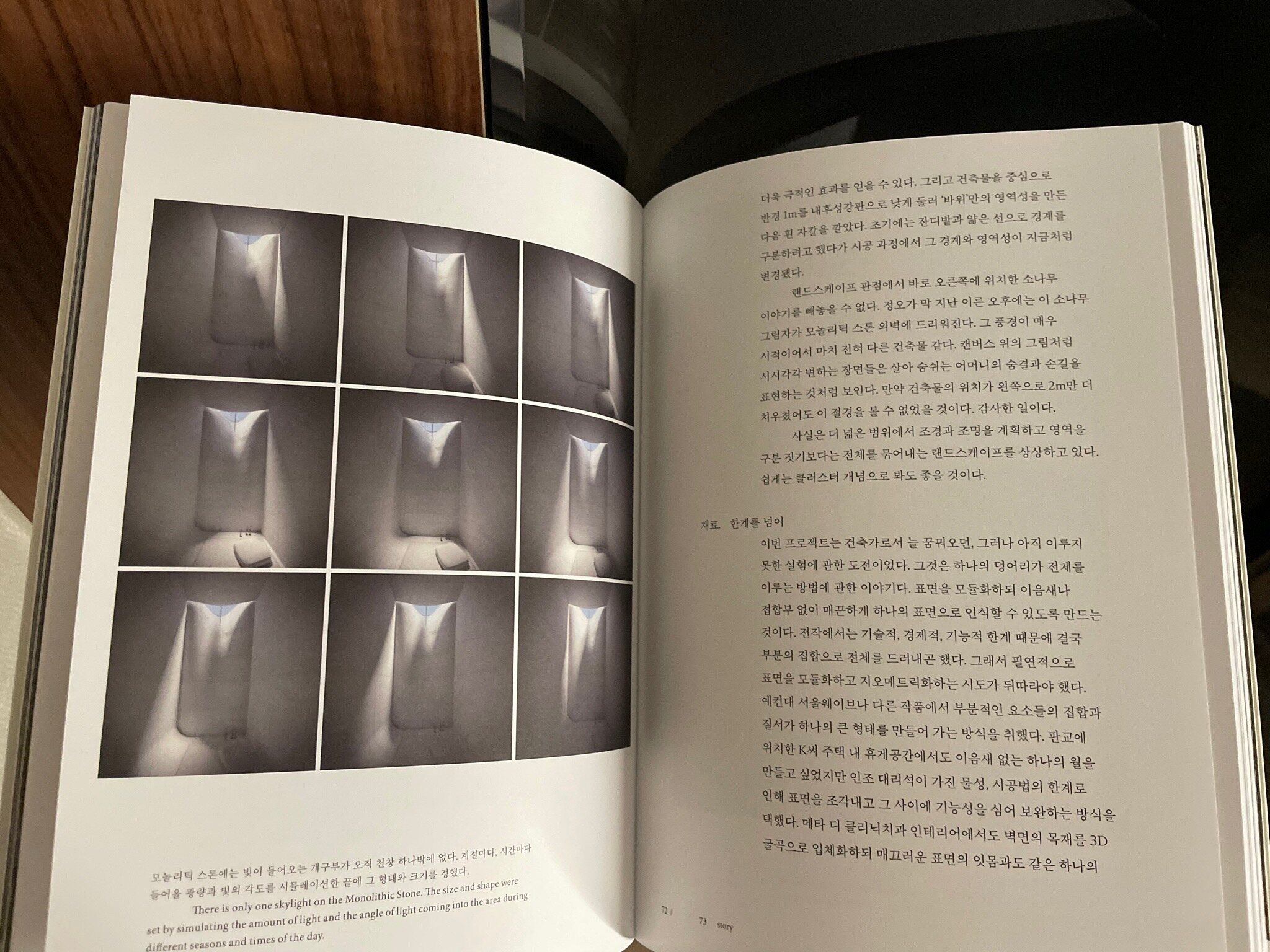 Mono- 는 ‘alone, single의 뜻을 가진다. 즉 하나의’ ‘단일의’라는 의미를 가지는데 가령 모놀로그, 모노레일와같은 단어를 떠올리면 이해가 쉬울 것 같다. 그럼 모놀리틱 스톤은 무슨 뜻일까? 획일적인, 하나로 된 이라는 뜻의 모놀리틱과 돌.. 하나로 된 거대한 바위(라니!) 제목에서 유추할 수 있다. 대학진학을 앞두고 문과인 나는 상경계열의 경영과 회계 그리고 무역 혹은 사회과학계열의 경제와 금융 중 고민을 하면서 마음 한켠엔 늘 건축에 대한 갈망이 있었다. 전공으론 회계학을 공부하면서도 교양으론 모두 건축 공간 조경과같은 과목을 신청하여 수강했었다. 친구들은 내 시간표를보면 경영학도야 건축학도야?라고 묻던 기억이 난다. 평소 동경하던 분야인 건축에 관한 스토리와 과정이 담긴 책이라 그런지 서두가 길었던 것 같다. 모놀리틱 스톤 그 주인공은 조신형 건축학자가 부산 기장에 위치한 한 개인의 저택 마당 공간에 지은 단 한사람만을 위한 맞춤 기도공간이다. 사념을 지우고 싶을 때, 무언가에 몰두해야할 때, 세상과 잠시 분리될 수 있는 독립된 공간이 존재한다는 것 만으로도 개인의 안식에 큰 의미있을 듯 하다. 개인적으로는 책에서 소개된 이 곳이 탄생하게 된 영감을 준 독일 쾰른 근교의 Bruder Klaus Field Chapel 이라는 한 농부 개인의 예배당 건물도 참으로 의미있고 인상깊었다. 쾰른의 채플도 기장의 모놀리틱 스톤도 모두 빼곡한 건물들 사이에 있었다면 지금과같은 인상을 주었을까?싶다. 주변에 복잡한 것들이 아무것도 없이 푸른팥 사이에 혹은 조용한 사유지 사이에 조용히 우두커니 덩그러니 있어서 더욱 의미있는 것 같다. 빛 한줄기와 바람에 조용히 춤추는 나무나 풀만이 있을 뿐. 고요함 속에 있는 개인의 공간이기에 더욱 건축 외관이 주는 수려함과 내부의 경건함 그리고 건물 존재의 의미가 더욱 빛나는 듯 하다. 나무 옆 계단 두어칸을 내려와 200kg이 넘는 문을 열고 들어가면 183cm의 주인공이 눕고 간신히 팔뻗을 공간을 철두철미하게 계산하여 만든 거대하고도 작은 이 공간. 책의 뒷편에는 과정들이 사진과 글로 상세하게 묘사되어있는데 다시한번 건축의 매력에 매료되었던 것 같다. 이음새나 접합부없이 매끈한 하나의 표면으로 구현하기까지의 그 숨막히는 과정이 참 아름답다. 건축가 조신형씨는 글재주도 참 뛰어난 작가라는 생각이 절로 드는게 책 속 표현도 꽤나 감탄을 자아내는 구절이 많다. 특히나 건물 내부로 들어오는 빛에 대한 표현은 책을 세번이나 정독하면할수록 또렷하게 다가온다. 모처럼 몰두해서 재미있게 읽은 책인 것 같다^^