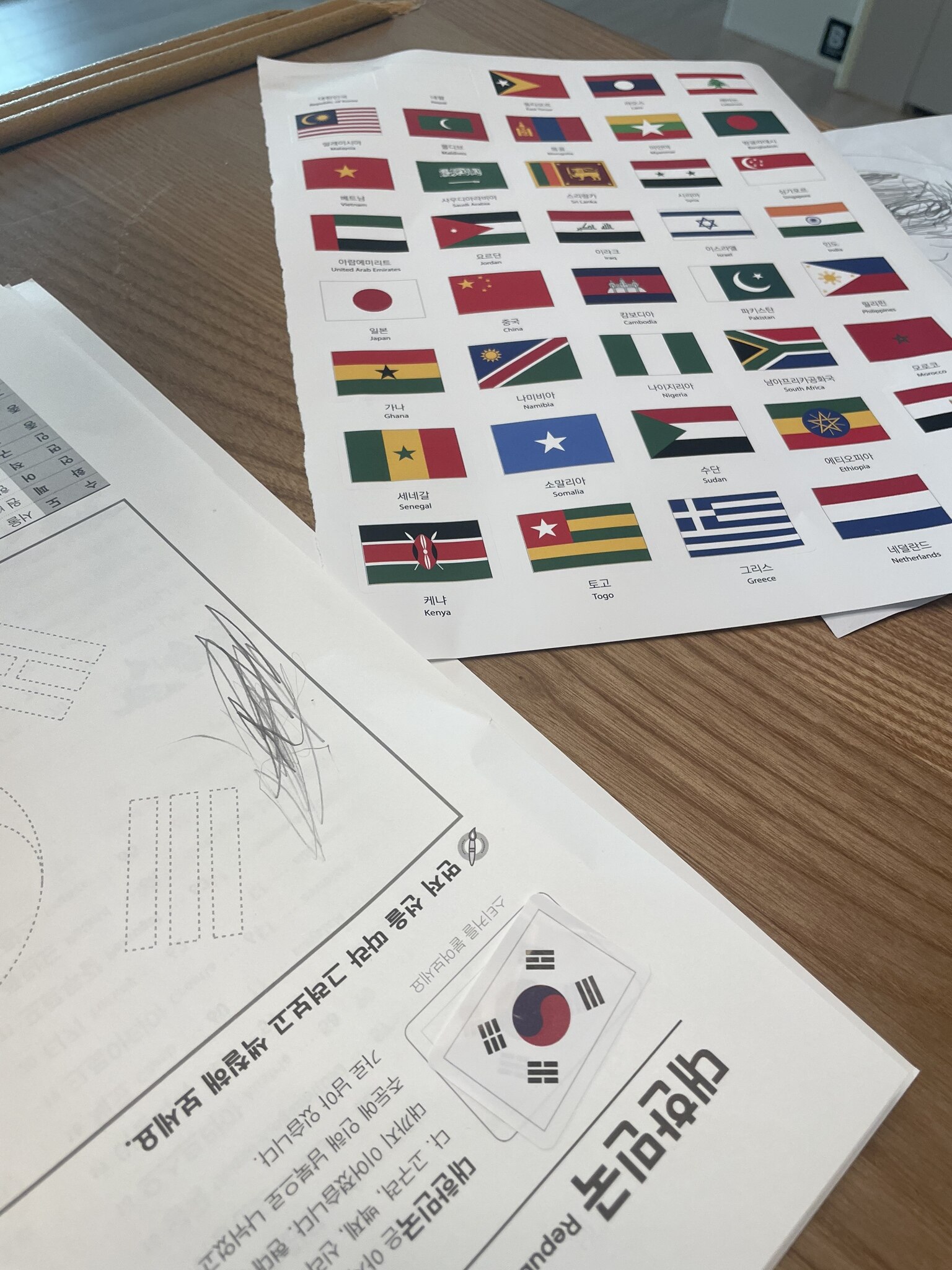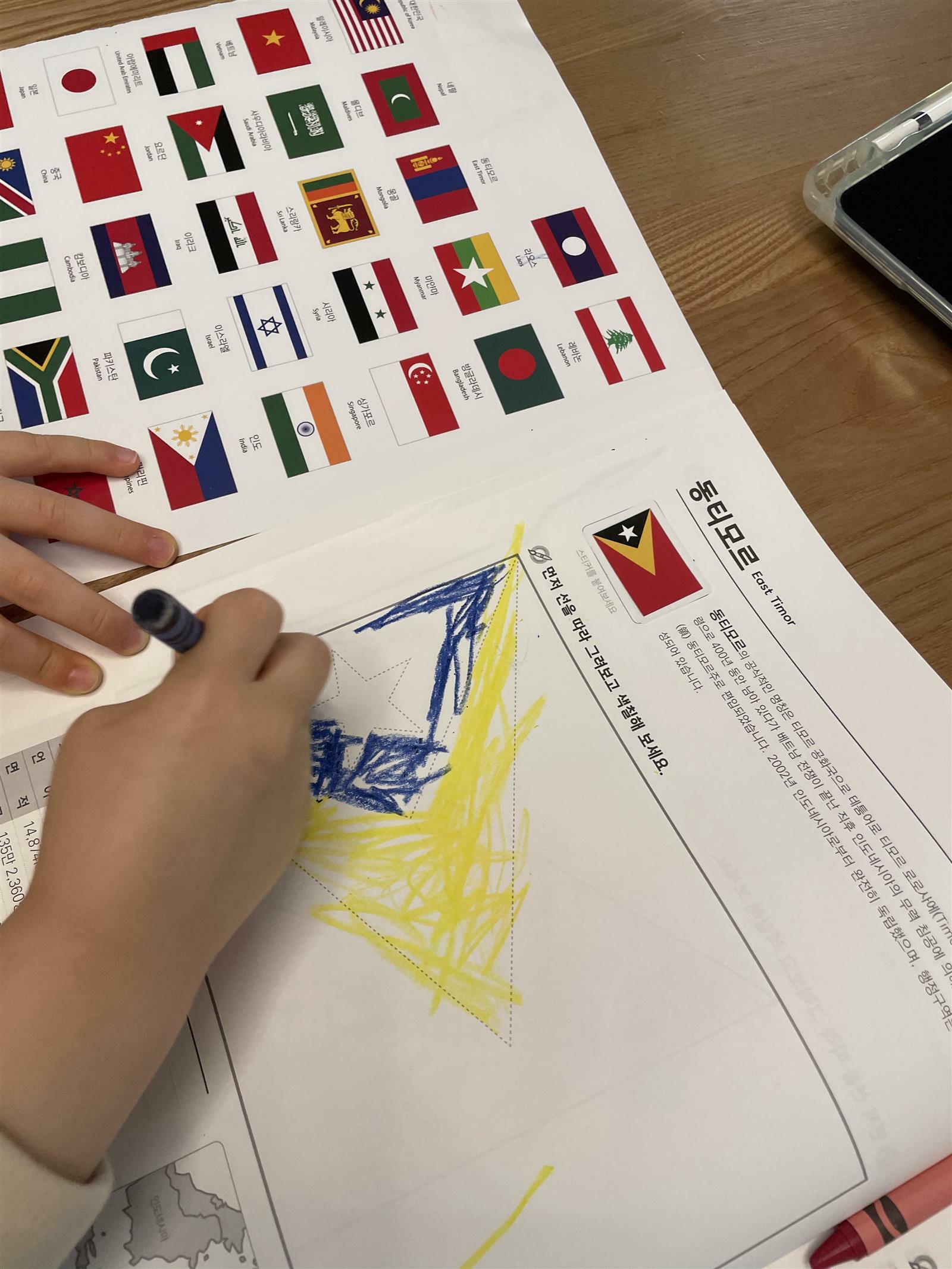 2022년 카타르 월드컵 때 우리아이와 함께 신나게 응원하면서 다양한 나라이름을 아이가 인지하게된 것 같아요. 특히나 축구에 진심인 엄마덕에 새벽 중계때는 아이가 자고있었지만 하루종일 (꼭 대한민국 경기가 아니더라도) 주요경기 하이라이트를 보다보니 아이도 이건 무슨 나라야? 이건 색깔 예뻐~ 하며 관심갖더라구요. 특히나 선수들의 유니폼은 그나라 국기와 유사한 컬러다보니 이참에 아이에게이 지구엔 이 세상엔 다양한 나라가 있다는걸 알려주고싶었어요. 집에 세계지도나 지구본이 있다면 함께 학습하면 더 효과적인 것 같아요. 가나북스의 세계 국기 여행하기 ( 그리기 / 스티커 / 색칠하기 ) 책은 꽤나 알차고 유익하게 구성되어 있습니다. 꼭 아이들이 아니더라도 성인들도 나라의 국기나 수도는 어느정도 교양이나 상식으로 알고싶기도하고, 순수히 관심도 가져보며 외워도 보았던 기억들이 있을 것 같아요. 아이와 함께 보며 아 이나라 국기 이거였지? 이 두 나라는 국기 색은 같은데 배치가 다르구나~하며 같이 재미있게 본 것 같습니다. 좌측상단에 스티커를 찾아 붙이고, (스티커가 페이지 순서대로 있어 한글을 모르더라도 & 이미지가 헷갈리더라도 어렵지 않아요!) 가운데 큰 면적으로 스티커의 컬러를 보며 색칠하기를 할 수 있고, 하단에는 그 나라에 대한 설명과 지도상 위치가 함께 나와있어서 참 좋았습니다. 아이가 스티커를 떼고 컬러링하며 소근육도 기르고, 방금 찾은 이 나라는 집에있는 지구본이나 세계지도를 보며 어디에 있지~하고 찾는 재미도 있었답니다. 우리아이는 코로나시국 속에 자라 비교적 여행경험이 적은데요, 이렇게 책을 통해 해외여행한 기분도 들고 세계적인 축제가 있을 때 어떤 나라였는지 대화를 시도해보기도 좋고 무엇보다 아이에게 다양한 나라가 있다고 인지시켜주기에 좋은 책이었습니다. (색칠공부 하기에도 뚜렷한 선들과 익숙한 컬러들로 구성되어있어 참 좋아하네요!)
