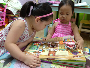 한페이지 한페이지 큰아이가 둘째에게 읽어주고 있어요