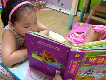 잠시 볼일보러 다녀온 언니가 돌아와 열심히 백설공주 이야기를 읽어줬어요