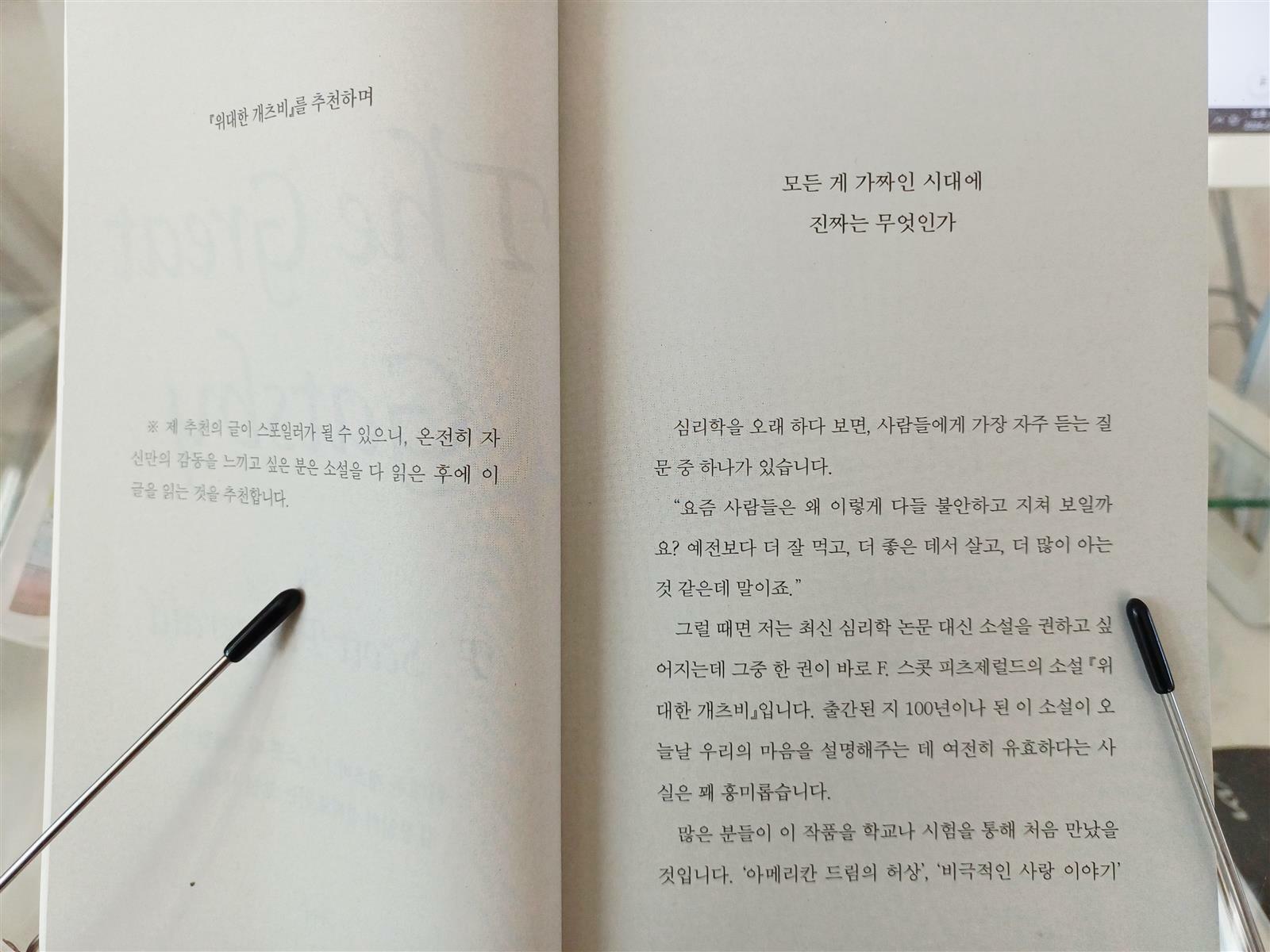 *본 리뷰는 리뷰어스클럽의 지원을 받아 개인적인 견해로 작성하였습니다.* 위대한 개츠비. 영화로도 잘 알려진 유명한 고전 작품이다. 위대한 작품을 30여년 살면서 이번에 처음 책으로 접해본다. 이 책을 배송받기 전부터 얼마나 기대되고 떨리는지 빨리 읽어보고 싶은 맘이 컸는지 모른다. 개츠비의 줄거리는 모두가 다 아는 내용이다. 이 책의 하이라이트는 김경일 교수님의 견해가 담겨있는 앞부분으로 이 책의 배경의 자세한 설명과 등장인물들이 말했던 대사들에 담겨있는 심리를 분석하여 내용을 해석해준다. 나도 읽으면서 궁금했던 대사가 ('그녀의 목소리는 돈으로 가득 차 있어요' ) 있었는데 개츠비는 어떤 생각으로 말을 내뱉었을까 궁금했었다. 이 때 당시 개츠비의 심리와 생각을 분석해주셔서 깊게 이해할 수 있었다. 분석글을 읽으니 재독을 해야겠단 욕구가 생겼다. #스콧피츠제럴드 #위대한개츠비 #김경일교수 #김경일의심리로읽는고전시리즈