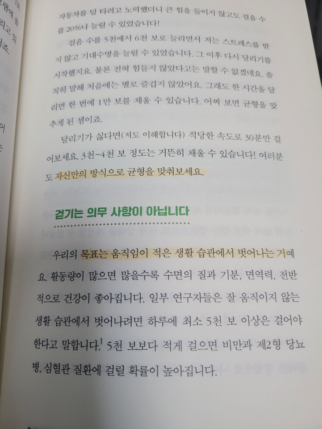 책에서 강조하는 것은 작은 습관들의 누적이다. 저자는 "큰 변화보다는 작은 실천"이 중요하다고 말하면서, 항상 빡빡하게 조이는 삶보다는 어느정도 숨구멍이 필요하다고, 매일같이 무리하며 달려나가는 것이 아닌 완급 조절, 조금 더 건강하게 살아가기 위해 노력하는 것을 이야기하고 있다.