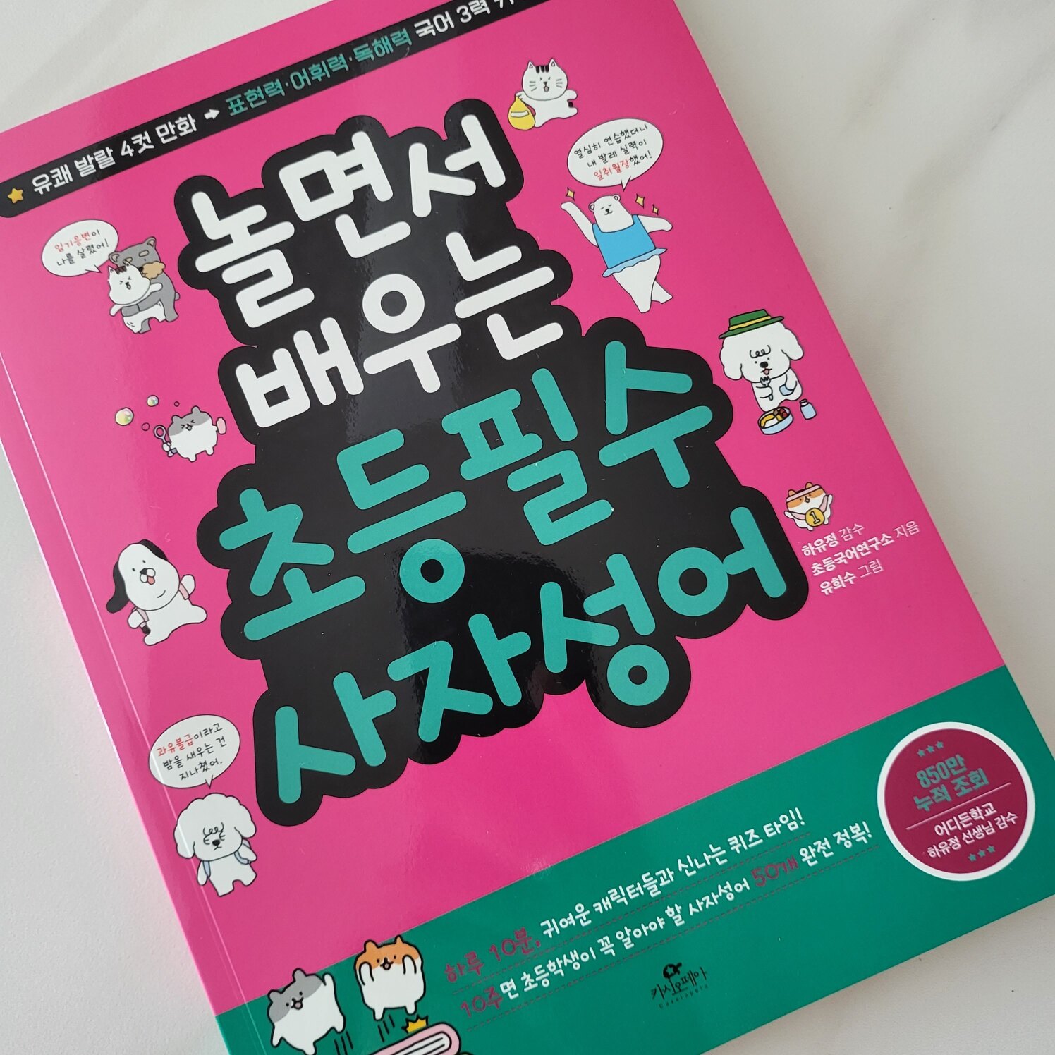 『놀면서 배우는 초등 필수 사자성어』는 카시오페아의 '놀면서 배우는' 시리즈의 하나로 초등 필수맞춤법, 속담, 관용표현 등이 함께 출간되어 있고, 우리 집에서는 '놀배'시리즈 중 '속담' 편을 아주 유용하게 공부해보았던 터라 '사자성어' 또한 기대를 하고 시작했다. '놀배 시리즈'는 매일 10분 정도의 짧은 시간에 캐릭터와 놀면서 자연스럽게 익히기에 쉽고, 재미있으며, 단순히 속담이나 사자성어만 배우는 것이 아니라 다양한 표현력과 어휘력, 독해력 등도 한꺼번에 익힐 수 있어 너무 좋다. 또 학교에서 당장 '써먹을 수' 있는 것들이 등장하기에 학교수업과도 연계성이 높다는 장점이 있다.