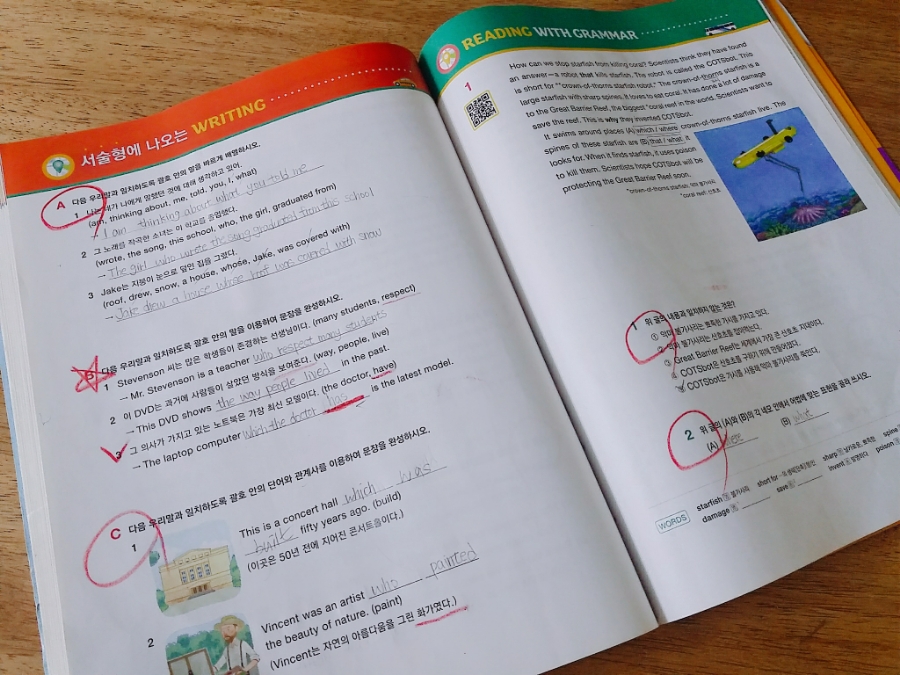 요즘은 워낙 교재들이 잘 나오니 집에서 꾸준히만 한다면 학교 내신은 어렵지 않아요