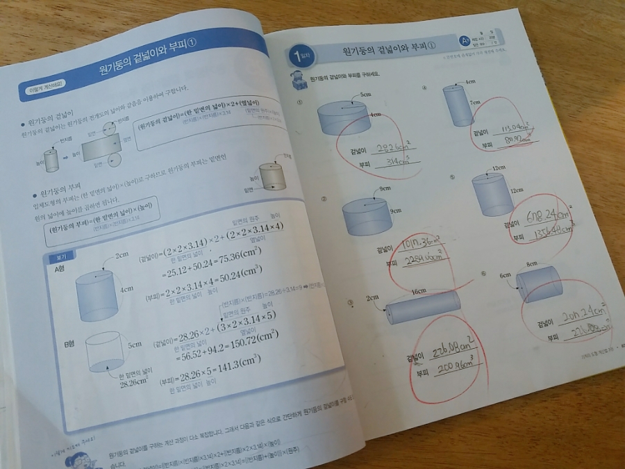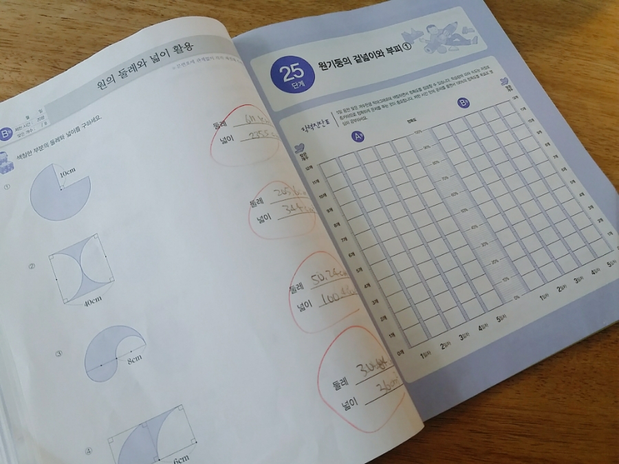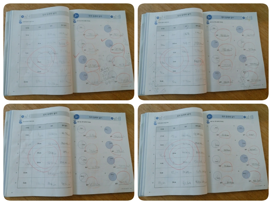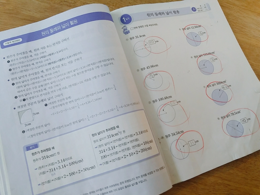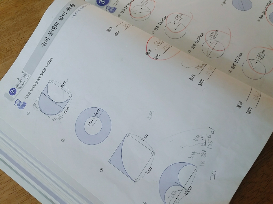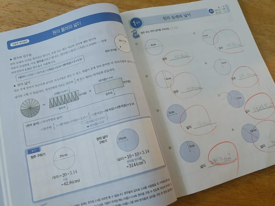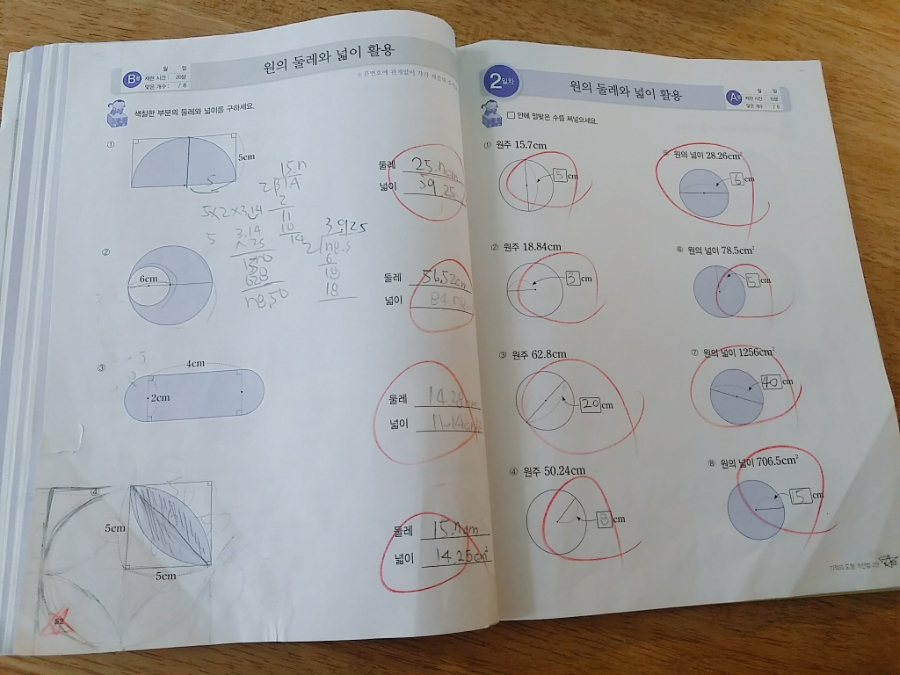 원의 둘레와 넓이는 연산 실수는 있었지만 잘 풀어 주었어요