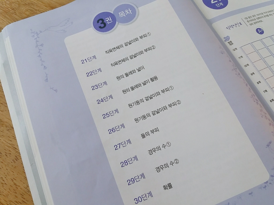 3권에서는 직육면체의 겉넓이와 부피/ 원의 둘레와 넓이/ 원의 둘레와 넓이 활용/ 원기둥의