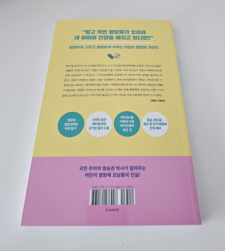 이 책에서 말하는 아이들의 영양제에 관한 문제의 핵심은 효과에 대한 근거가 없는 영양제나 비타민, 건강기능 식품에 시간과 돈을 낭비하기 보다는 음식을 골고루 먹여라 라는 것입니다.