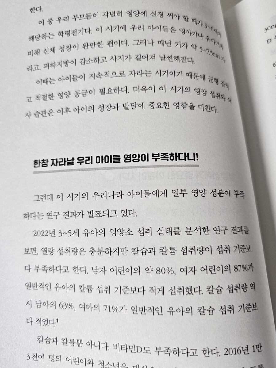 이 책에서는 부모님들이 아이들의 영양을 위해 가장 신경써야 할 때는 3~6세이고 이 시기는 아이들이 지속적으로 성장하는 시기이므로 균형 잡히고 적절한 영양공급이 필요하다고합니다.