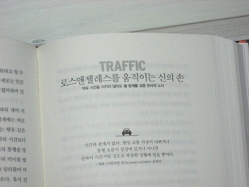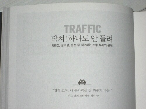 오너드라이버로 생활한지 벌써 10년이 넘었지만 면허를 따고 황홀감을 누리던 잠시를 제외하고는 예나 지금이나 운전대만 잡으면 나는 또 다른 나로 변신(?)을 한다. 아이러니하게도 핸들만 잡으면 평소보다 성격도 급해지는 것 같고, 사소한 일에도 쉽게 흥분을 하게 된다. 트래픽. 이 책이 나의 시선을 사로잡았던 가장 큰 이유는 바로 이런 운전습관과 교통체계에 숨겨져 있던 인간의 비이성적인 본성에 관한 책이었기 때문이다. 오랜 시간 나 역시 직접 경험하며 생각해왔던 궁금증이기도 하다.