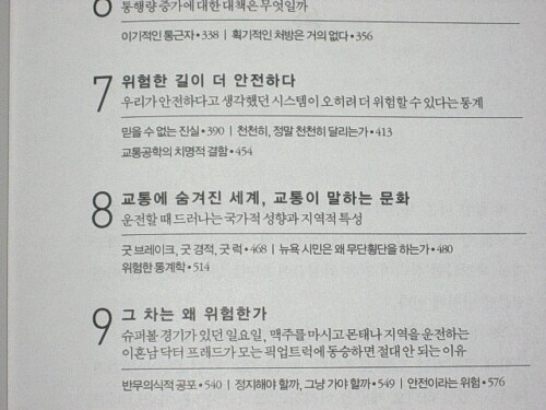 그동안 운전에 대한 감각이 무뎠던 것인지, 아님 운전자의 심리에 대해 통 관심이 없었기 때문이었는지 이 책으로 알게 된 운전자와 교통체계의 놀라운 비밀은 정말 입이 쩍 벌어질 정도였다. 도로 위에서 벌어지는 수 만가지 일들을 읽다보면 그 어떤 미스터리보다 더욱 흥미로운 주제가 바로 도로 위의 상황이 아닐까 싶은 생각이 든다. 교통을 주제로 사람들의 운전습관 이면에 숨어있던 운전자들의 심리, 인간의 본성에 이르기까지 트래픽은 분량도 상당한 책이었지만 (무려 770페이지 가까이 되는 책이다) 바로 내 자신의 이야기라는 공감을 이끌어 낼 수 있었던 책이었기 때문에 시간 가는 줄 모르고 읽었던 책이기도 했다.