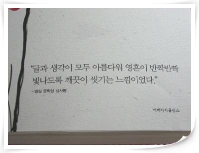 사랑하는 사람을 떠나보내고, 혼자서 감당해야만 하는 아픔을 겪어보지 않은 이들은 잘 모르겠지만 책 속에서 만날 수 있었던 저자의 아픔은 그 일이 마치 내가 직접 겪은 일인것처럼 슬프고, 안타까운 일들로 다가왔다. 하지만 인생이란 것이 삶과 죽음의 과정이라 생각해보면 우리가 만나고, 헤어지는 모든 일도 결국 그 과정속에 있는 일이다. 자신 스스로 직접 겪었던 아픔과 번뇌, 그리고 저자가 바라보는 삶과 죽음, 그리고 진정한 인생의 의미를 담은 구절들은 내 기억속에 오래토록 담아두고픈 말들이 참 많았다.