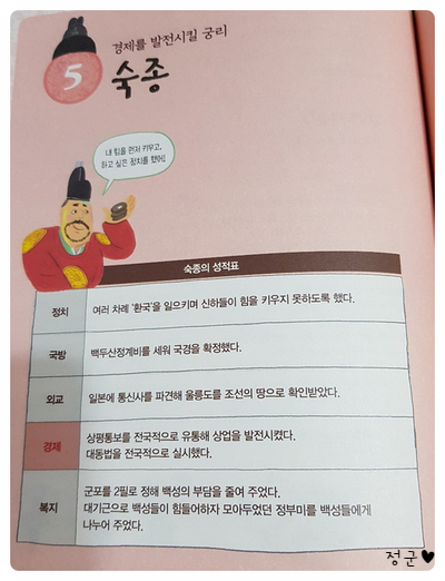 그중 한 명이 숙종이다. 어린 왕이었지만 신하들을 두려워하지 않았고, 주관이 뚜렷하고, 빠르게 결정하고 추진하였기 때문에 많은 신하들이 따랐다.