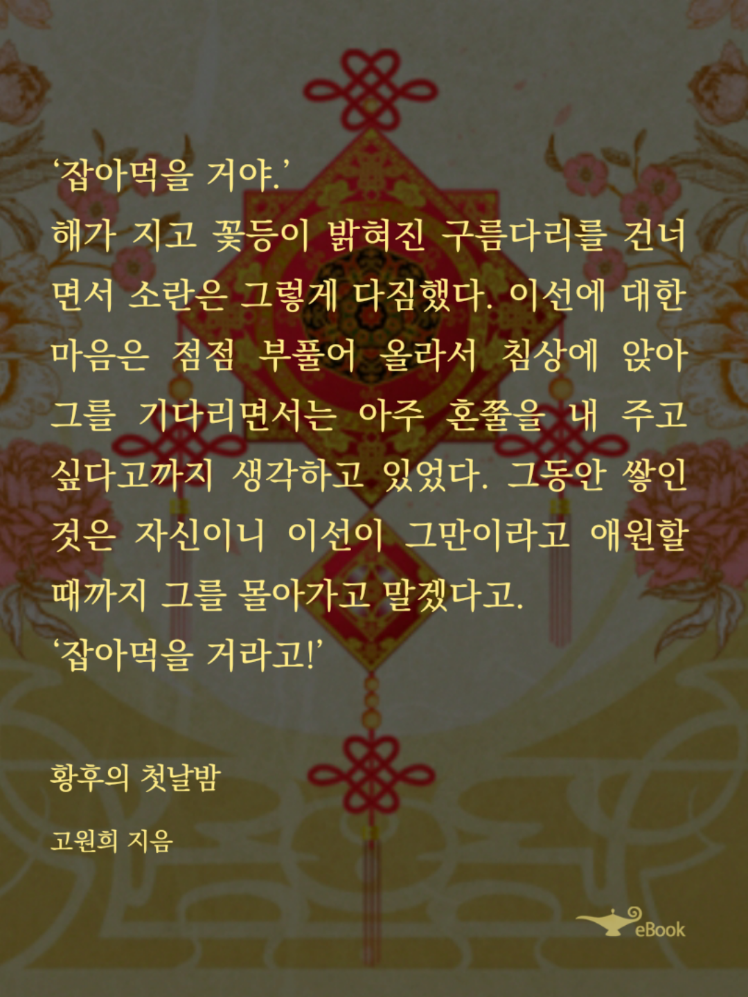 거의 씬 위주이고 짧은 글임에도 작가님이 캐릭터 빌딩을 잘하셔서 대화만으로 등장인물 성격을 알 수가 있습니다. 남주는 지위도 배경도 없이 순전히 능력만으로 황녀의 부마가 됩니다. 당연히 신하들이 하극상을 시도하나 여주의 파워쉴드 이후로 두 주인공의 관계가 깊어집니다. 어렸던 여주가 성숙하게 자란 모습에 남주는 점점 빠져들고, 아무것도 모르던 여주가 점점 적극적으로 변화하는 모습이 귀엽습니다.