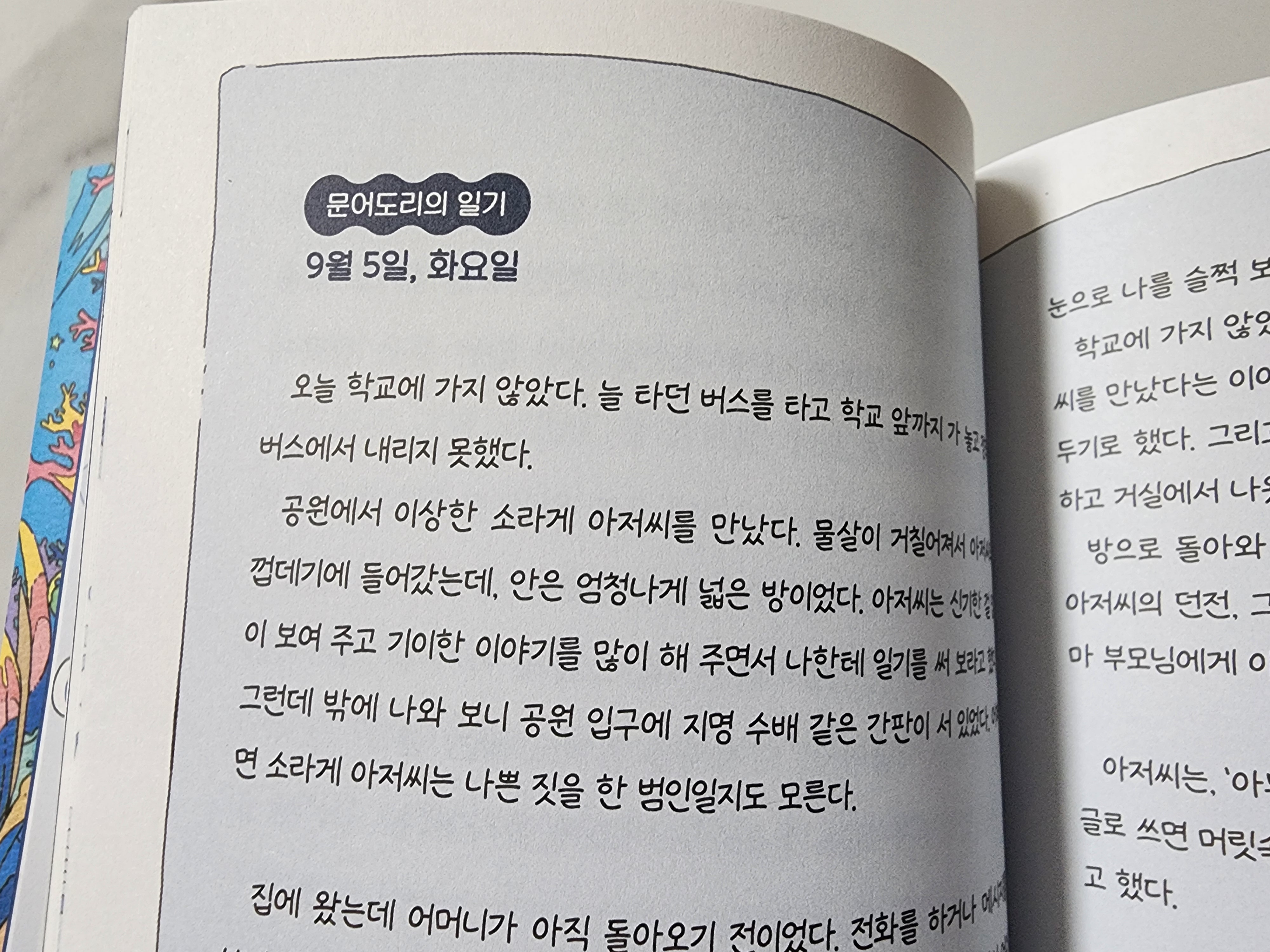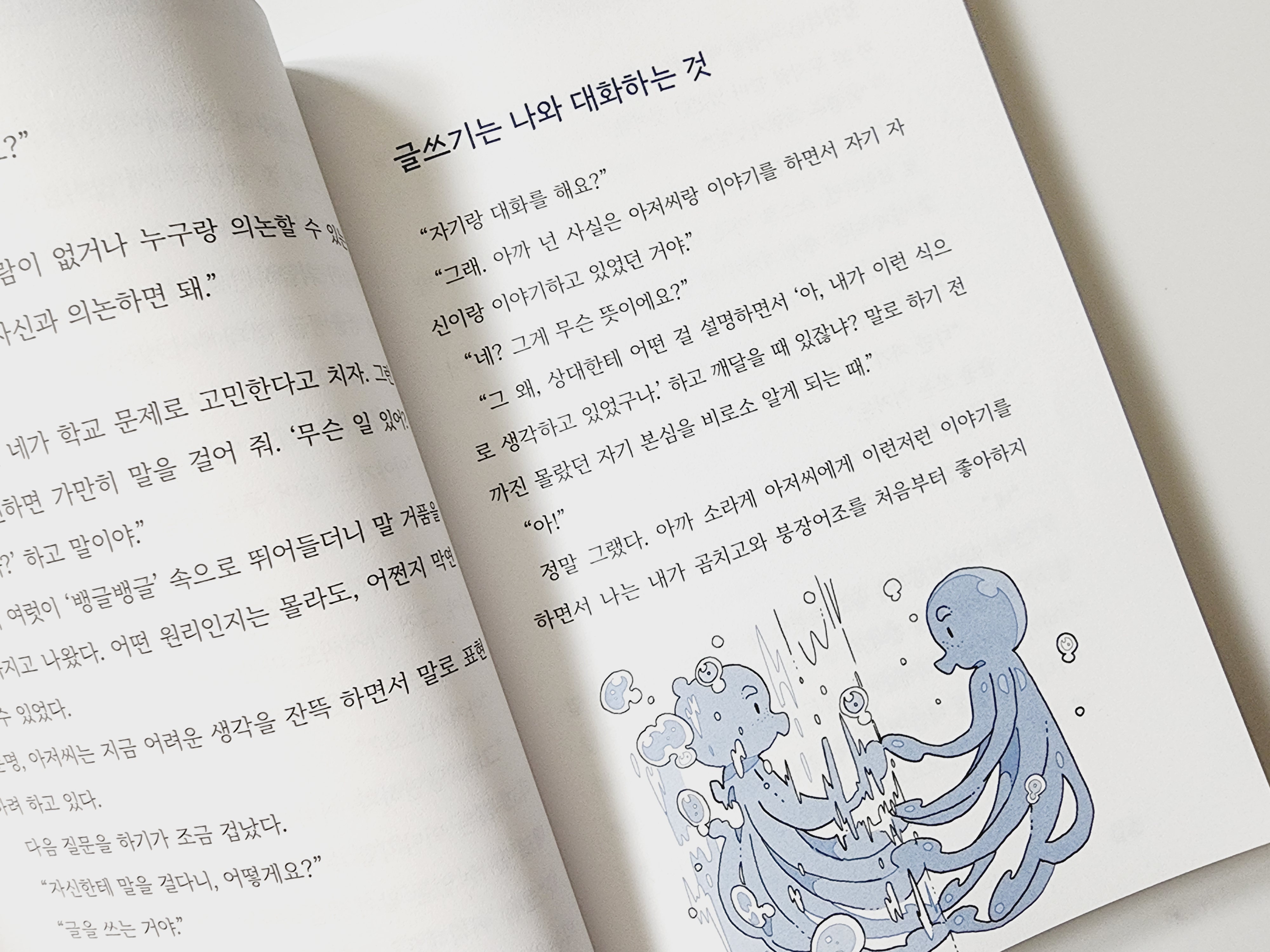 소라게는 문어도리에게 일기를 써보라고 조언을 해줘요.