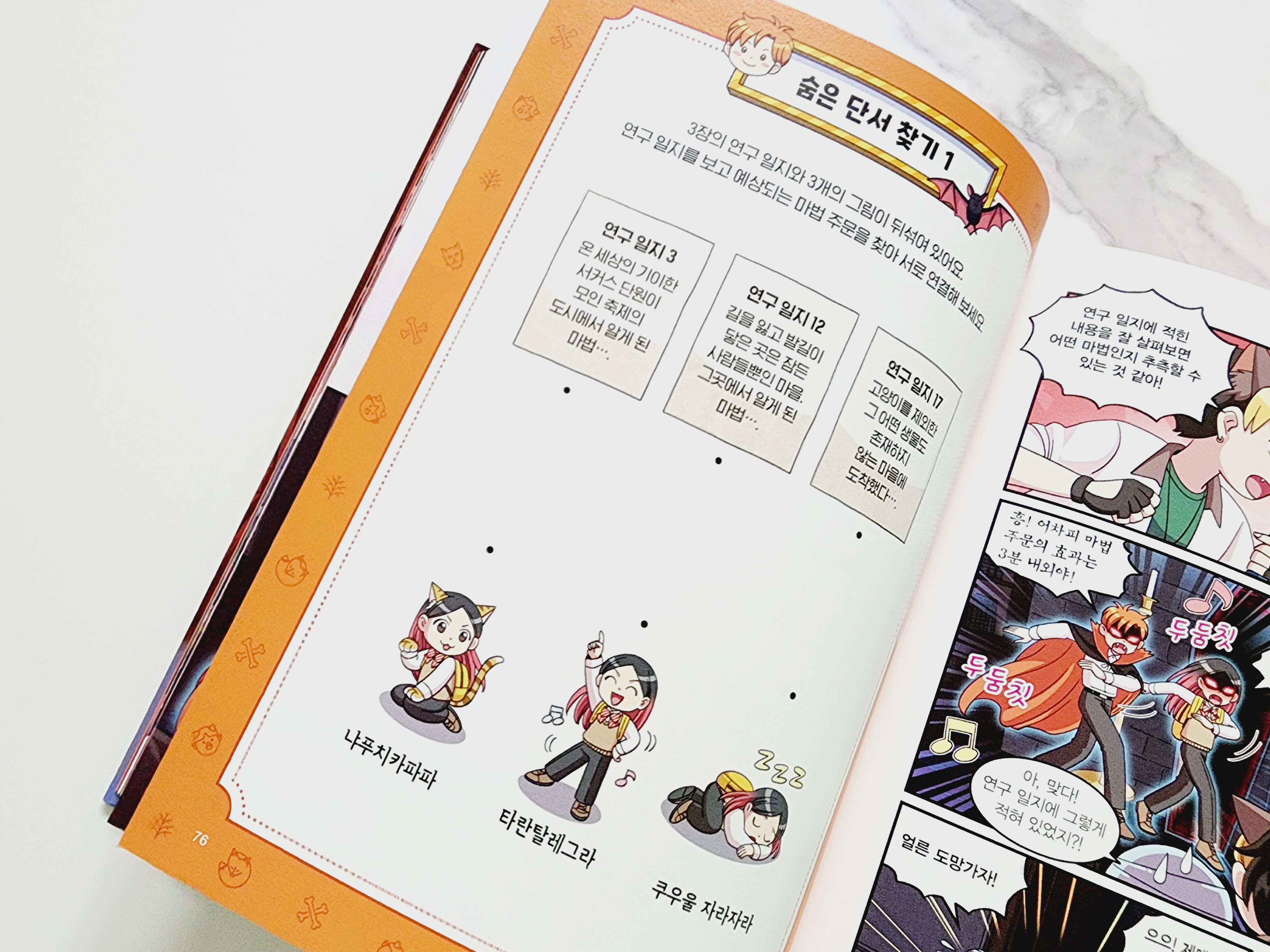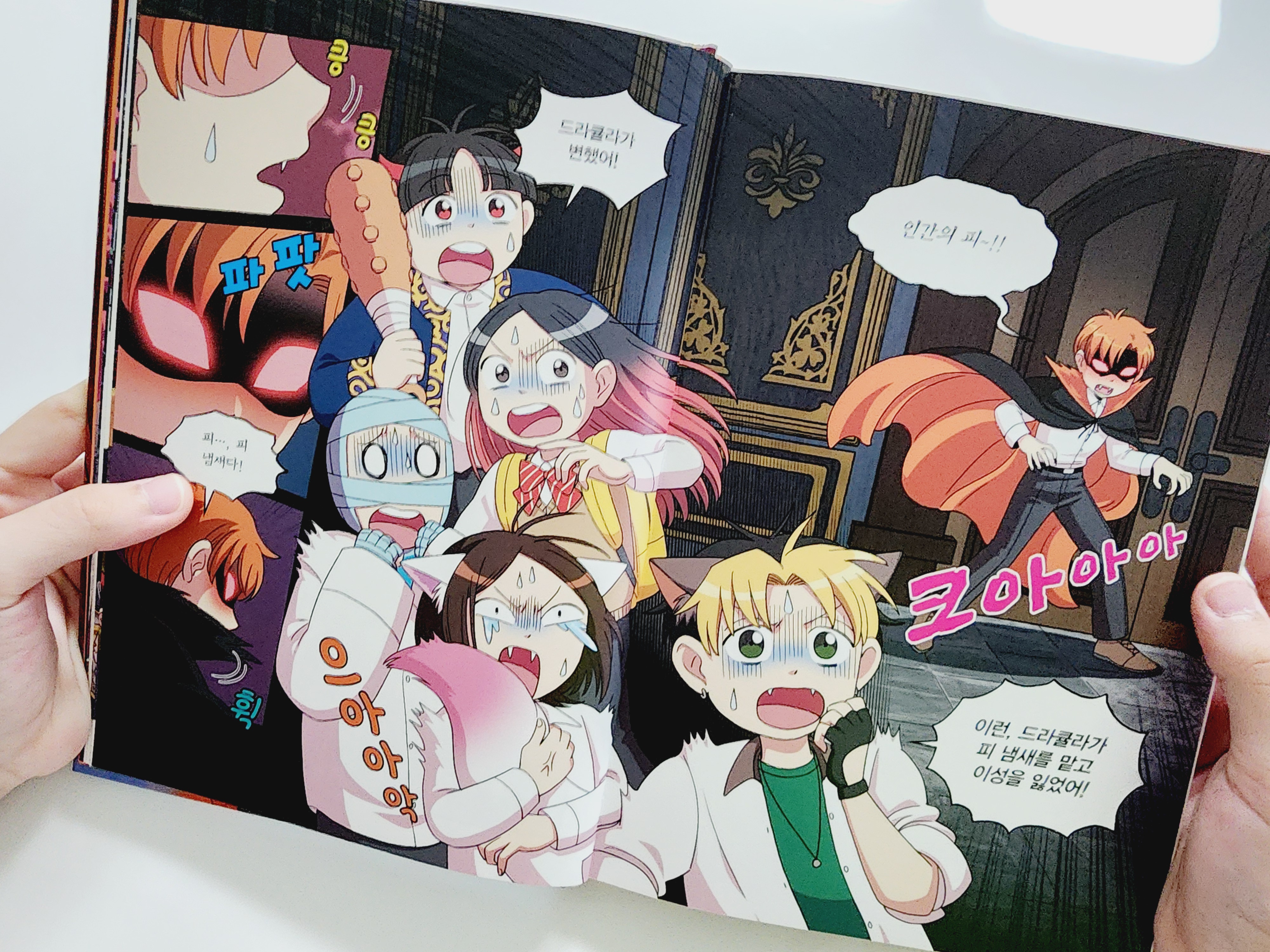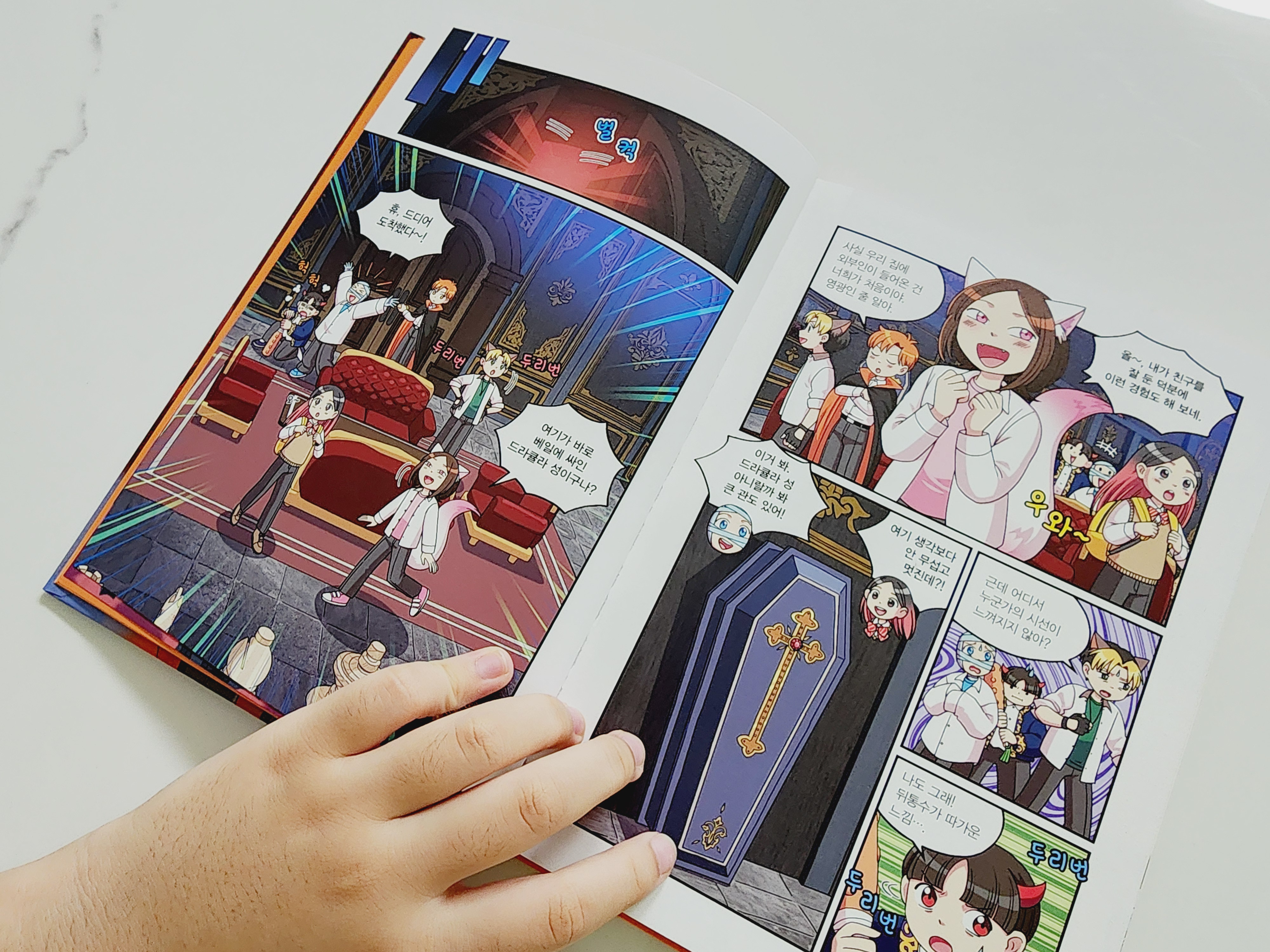 인기 많은 크리에이터 '웃소'의 판타지 미션 코믹북 < 환생학교 요괴반 4 > 인간의 피 냄새를 맡고 이성을 잃게 되는 드라큘라 이야기가 나와요^^판타지 sf 장르에서 제일 좋아하는 드라큘라 이야기라니!!아이가 제일 좋아하더라고요^^드라큘라성으로 가게 된 도깨비, 늑대인간, 구미호, 투명인간, 드라큘라, 유소정까지 !!마법진이 그려진 종이를 발견하면서, 차원의 문을 여는데 도움이 되지 않을까희망을 가지는데, 그 종이에 손을 베이고 마는 소정이...인간 피냄새를 맡고 이성을 잃게 되는 드라큘라까지 ㅋㅋ박진감 넘치게 몰아치는 스토리가 너무 재미있더라고요!중간 중간 숨은 단서를 찾아 미션해결까지 !미션활동을 통해 드라큘라를 원래대로 되돌릴 수 있는 단서를 찾아나가는데...스토리, 만화그림! 어느하나 빠지는것 없이 너무 재밌어요!아이가 너무 좋아하는 환생학교 요괴반4환생학교 요괴반5권 나올때까지 손꼽아 기다릴께요^^*출판사로부터 도서를 제공받아 작성한 후기입니다*