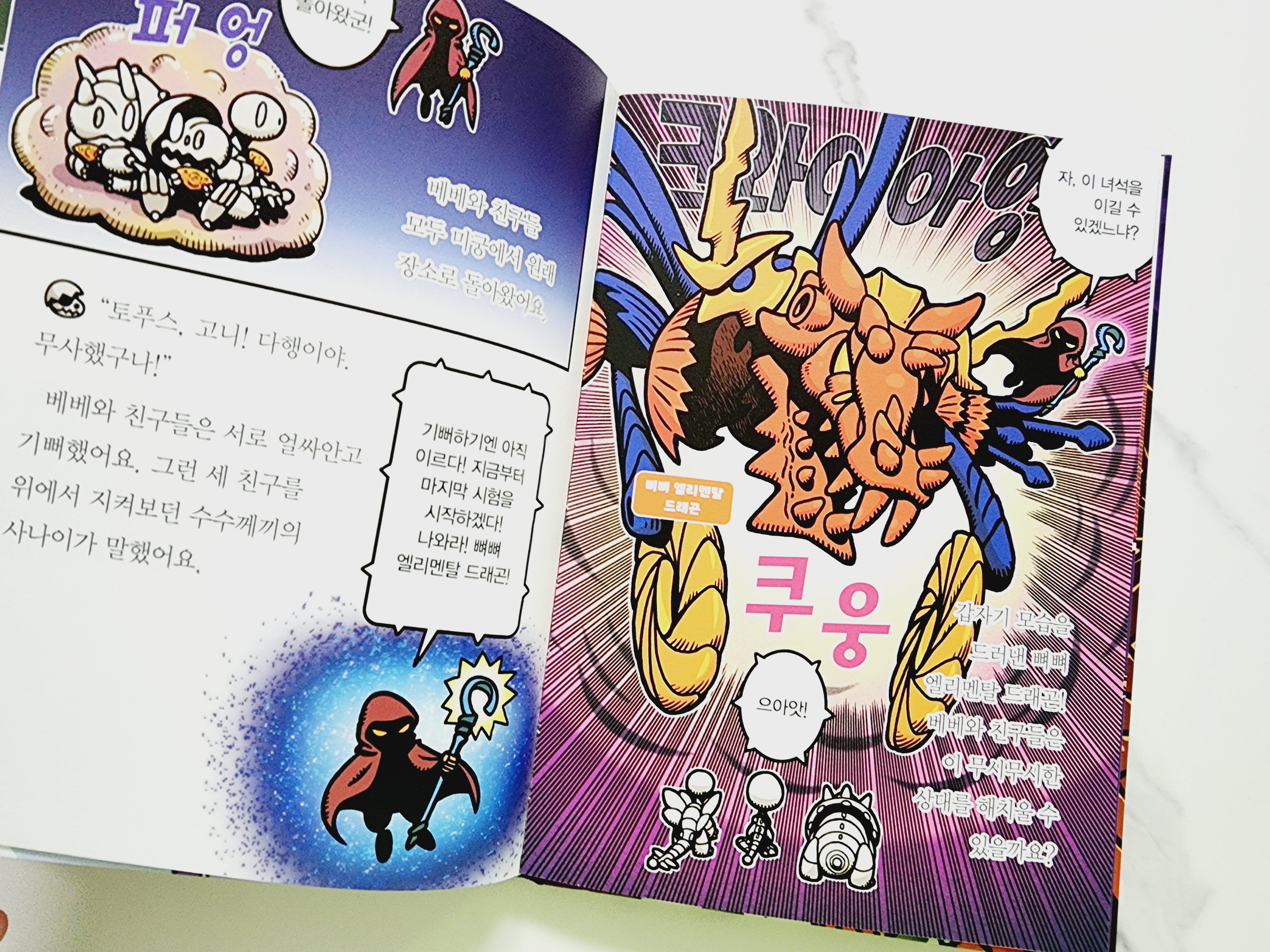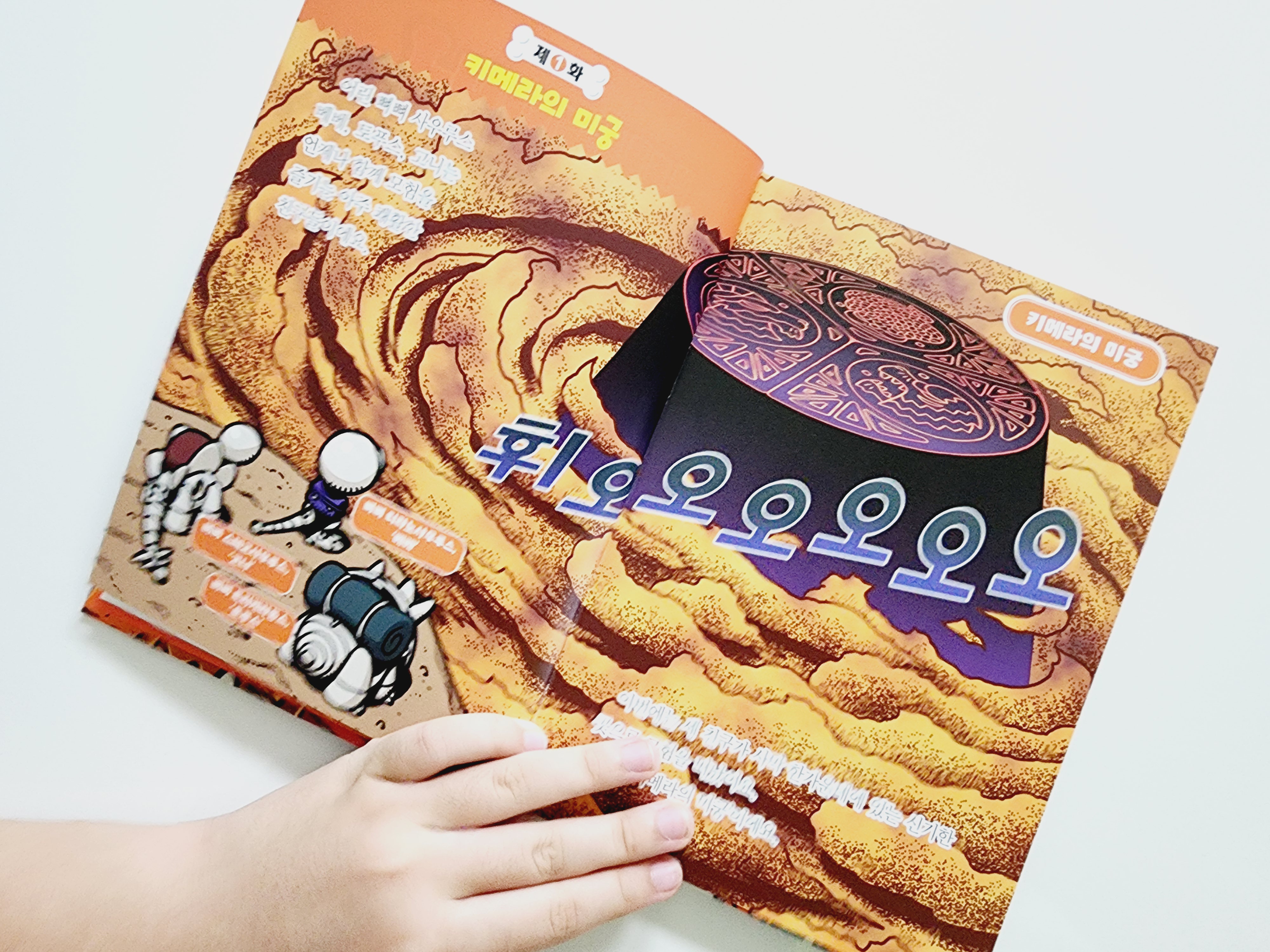 뼈뼈 사우루스 완결이라니! ㅠ벌써 완결인건가요? 아이가 정말 잘 보고 있었는데...7대 불가사의 그 마지막 '키메라의 미궁' 으로 떠나는 뼈뼈 티라노사우루스 '베베' , 뼈뼈 트리케라톱스 '토푸스', 뼈뼈 스테고사우루스 '고니' 친구들의 마지막 대모험!!< 뼈뼈 사우루스 18 - 도전! 마지막 7대 불가사의 >모래폭풍으로 한치앞도 볼 수 없어 더 무시무시한 '키메라의 미궁'으로대모험을 떠난 뼈뼈 사우루스!키메라의 미궁은 어떤 일이 생길지 궁금한데요~!키메라의 미궁 속에서도 힘의 미궁, 지혜의 미궁, 용기의 미궁을 지키는 정령들이 있는데, 여길 통과해야해요.각 미궁 속 미로가 나타나고, 미로는 단순한 미로가 아닌 규칙들이 있는 미로라 그냥 일반적인 미로보다 더 어렵더라고요. 그래서 더 재밌는 미션들! ㅎ엘리멘탈 드래곤의 등장!!뼈뼈 사우루스는 무사히 키메라의 미궁을 통과할 수 있을까요?귀엽고 용감한 뼈뼈 사우루스 친구들!험난한 모험 속에서도 굳세게 헤쳐나가는 모습들이 멋지더라고요!아이들에게 교훈을 주는 뼈뼈 사우루스!!배울점 많고, 재미있고, 놀거리도 많아서 좋아요!!*출판사로부터 도서를 제공받아 작성한 후기입니다*