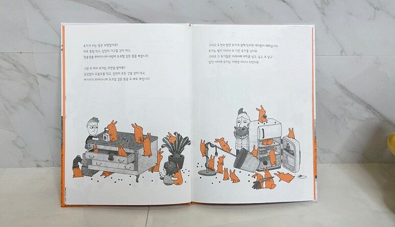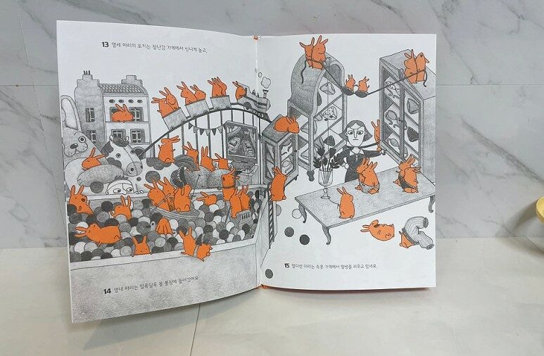 이 책에는 흑백 배경에 주황색으로 표현된 수많은 토끼가 등장해요