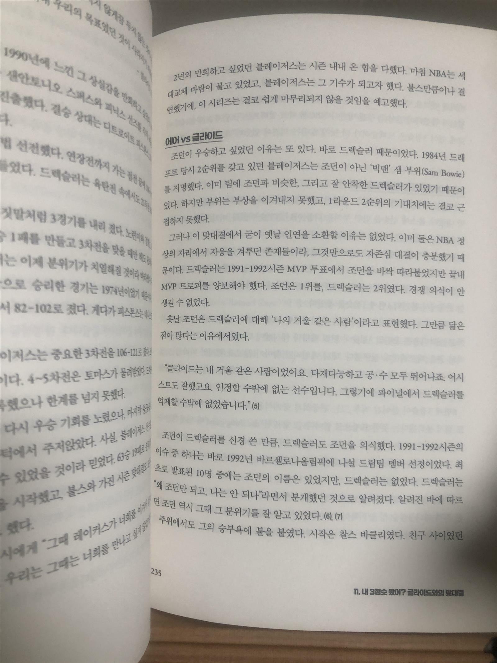 그런 판에 박힌 경로가 아니라, 저자는 조던의 인생에서 가장 빛나는 경기를 선별하여, 그 치열했던 현장 이야기를 재구성함으로써, 이 책이 설정한 목적지에 도달한다.