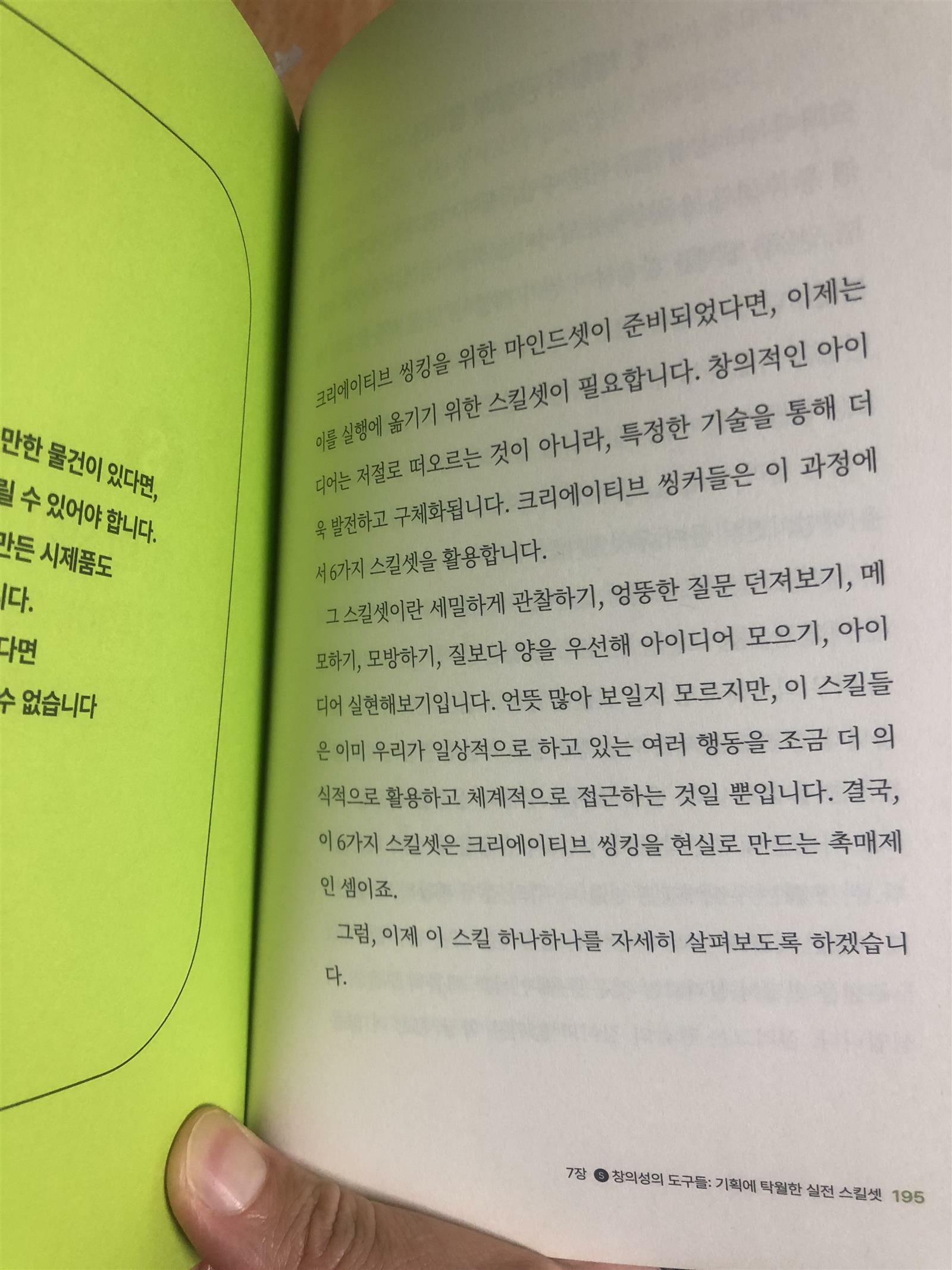 그 중 독자의 관심을 끄는 요소는 스킬셋으로, 창의력 발상과 실현을 위해서는 언뜻 그와 대척점에 있는 전문적이고 기술적인 지식이 필요하다는 주장은 실용적이고, 잘못된 편견을 바로잡는 시사점이 있다.